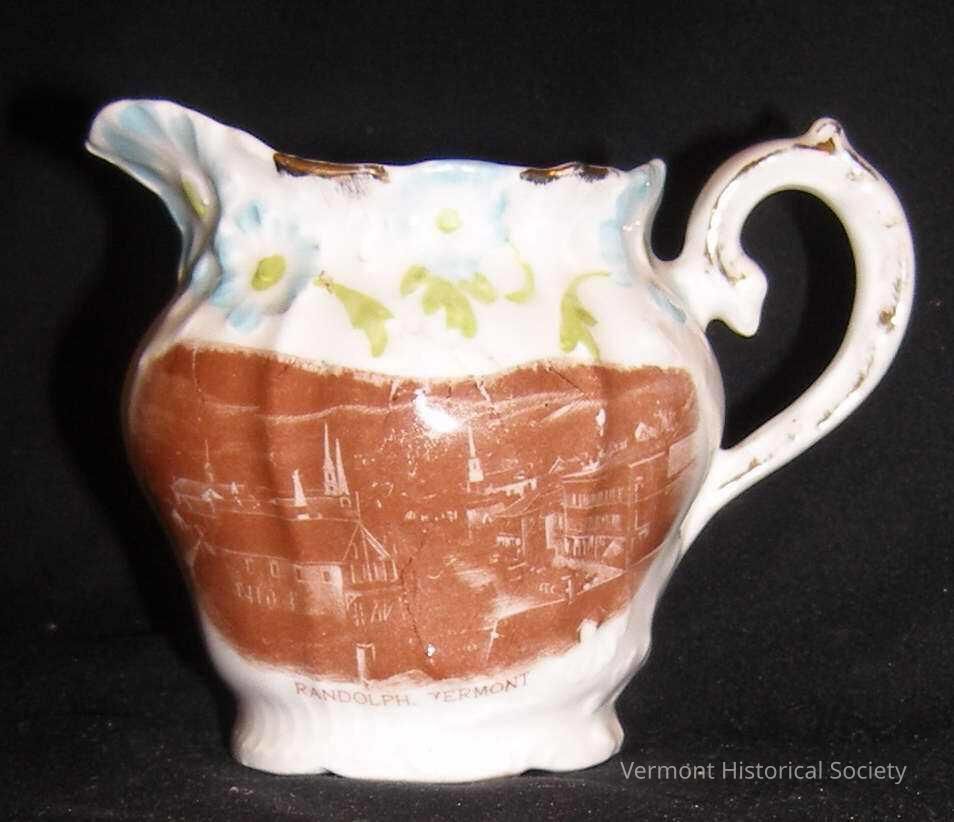 White ceramic cream pitcher decorated around the top edge with blue daisies and green leaves. The side is printed with a brown-toned photograph of a city street as seen from above. The image is labeled, "RANDOLPH, VERMONT". The bottom of the pitcher is marked, "MADE IN GERMANY FOR W. E. LAMSON RANDOLPH, VT." and "Weimar Germany".