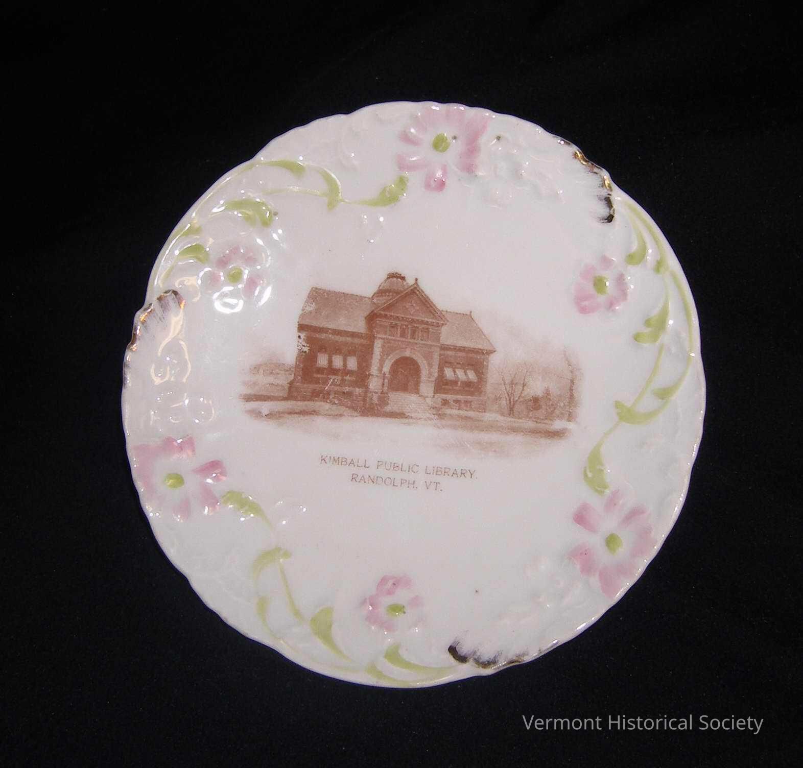 White ceramic saucer decorated around the edge with pink flowers and green leaves. The center is printed with a bronw-toned photograph of a brick building with arched entryway. The image is labeled, "KIMBALL PUBLIC LIBRARY RANDOLPH, VT." The bottom of the dish is marked, "MADE IN GERMANY FOR W. E. LAMSON RANDOLPH, VT." and "Weimar Germany".Context