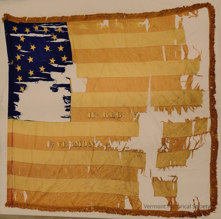 11th Vermont Infantry Regiment national flag. Attached to staff by sleeve. Canton style is rectangular, and is 24.5 in by 38 in. There are 34 gold painted stairs arranged in a double ellipse. The stripes are extremely faded, and measure 5.5 in width. Fringe is present. Some lettering in field.