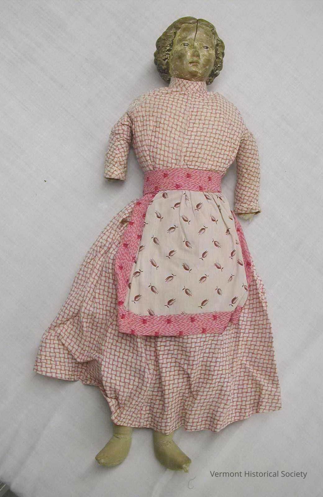 Doll with ceramic head and soft, cotton body. The doll has molded hair and painted blue eyes. She is wearing a one-piece dress made of white and pink check printed cotton. She is also wearing an apron that secures at the waist. The apron is white cotton printed with pink buds and bordered in pink cotton printed with darker pink faux-ikat lines and flower buds. The waistband is stitched closed at the center back. The ceramic hands and forearms are now missing.Context