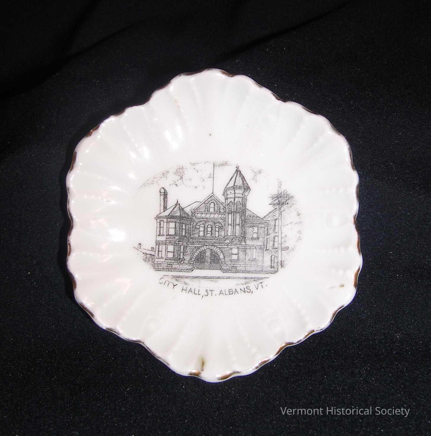 White ceramic cup plate with scalloped edge. The center is printed with a Victorian building with an arched entryway and multiple towers. The image is labeled, "CITY HALL, ST. ALBANS, VT." The bottom is marked, "Made in Austria expressly for H. M. Stevens & Co. St. Albans, Vt."