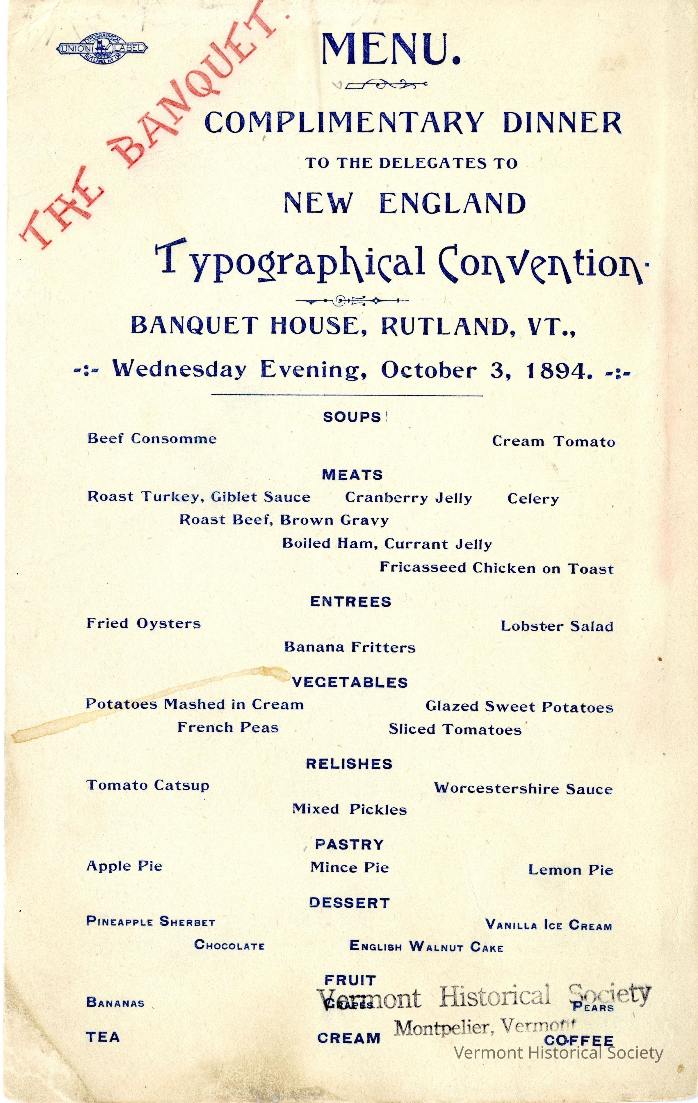Menu for a dinner for the delegates to the New England Typographical Conventio