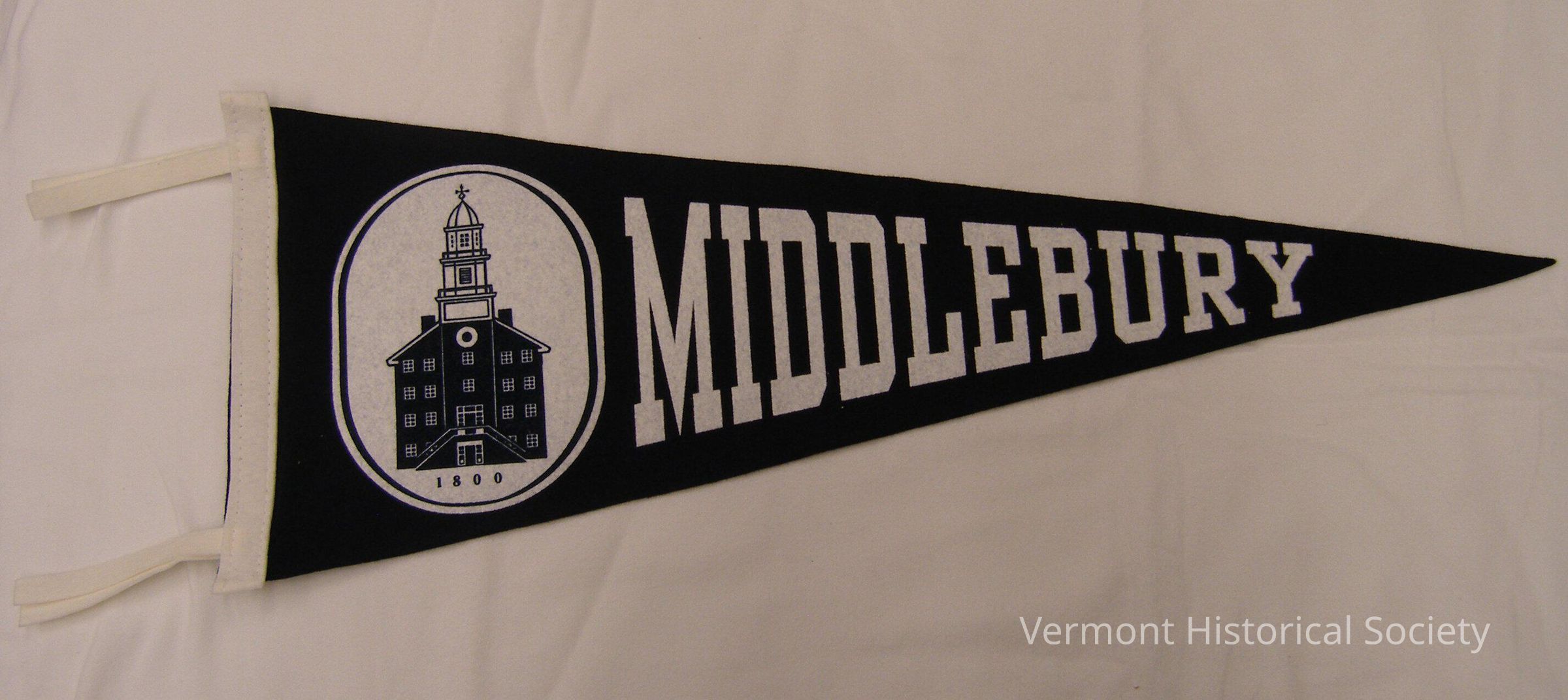 Navy blue felt pennant with white lettering: "MIDDLEBURY". To the left of the word is a white oval with blue building and the date 1800.