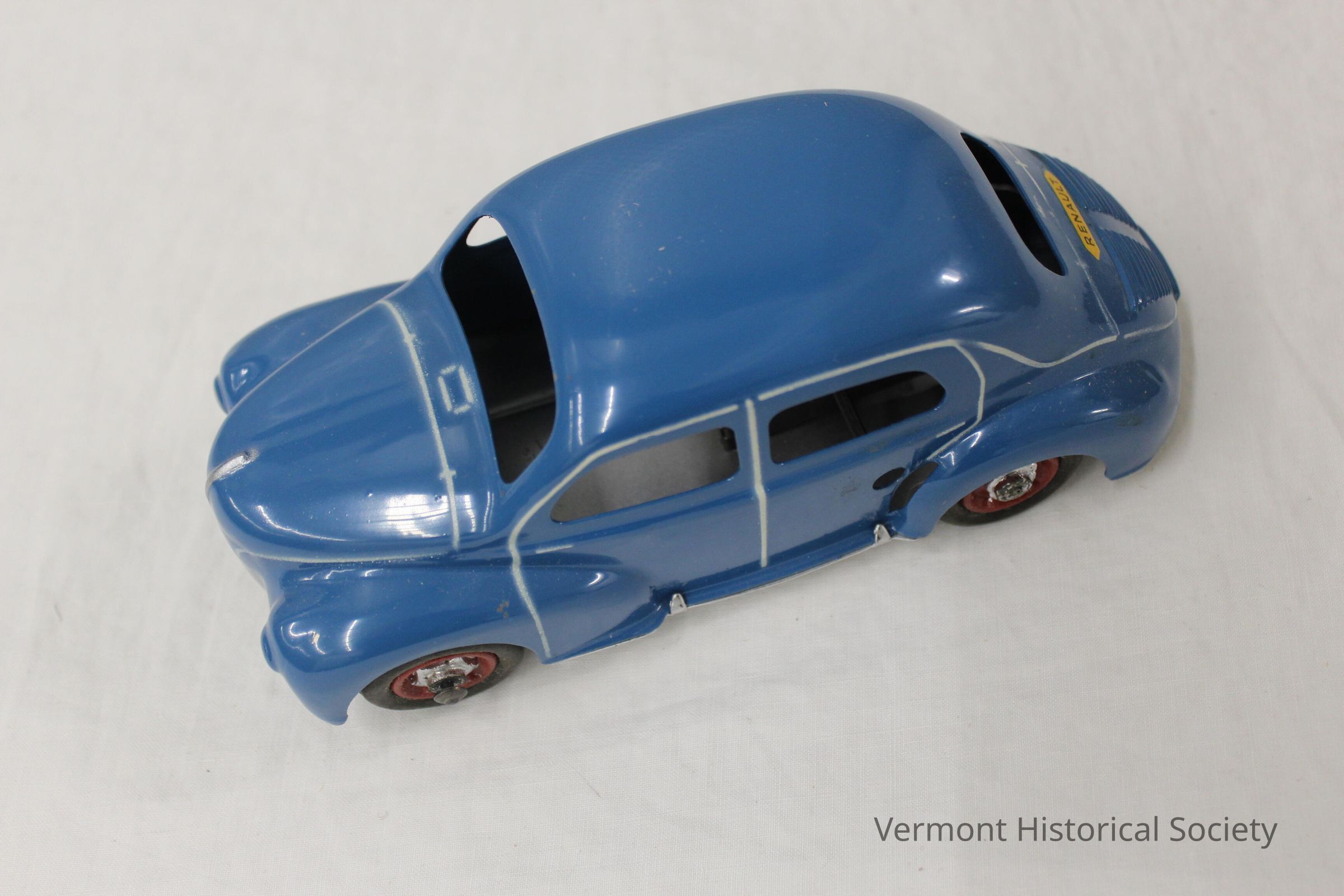 A windup metal toy Renault car, with rubber ties, a hole for a key, a switch to turn the front wheels, a painted license plate that says "Renault" and another diamond emblem on the back right that reads "4CV." This one is blue with white outline and doesn't have a key.Context