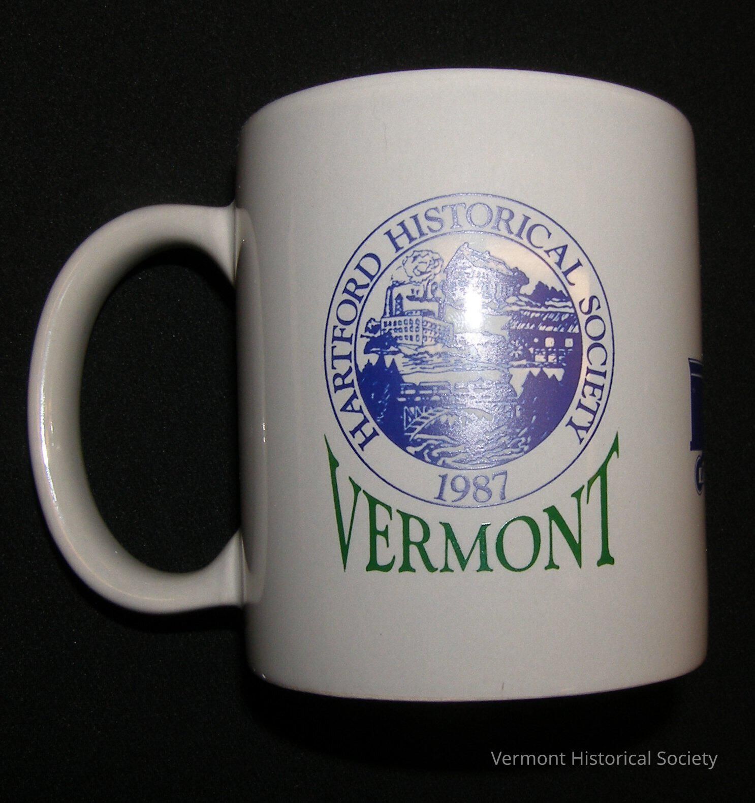 White ceramic mug. One side is printed in blue with the seal of the Hartford Historical Society, consisting of several local landmarks arranged inside a circle, above the word "VERMONT" in green. The other side is printed in blue with an image of a steam locomotive and the label, "OLD 494". The bottom has the mark, "Linyi * Headwind Made in China".Context