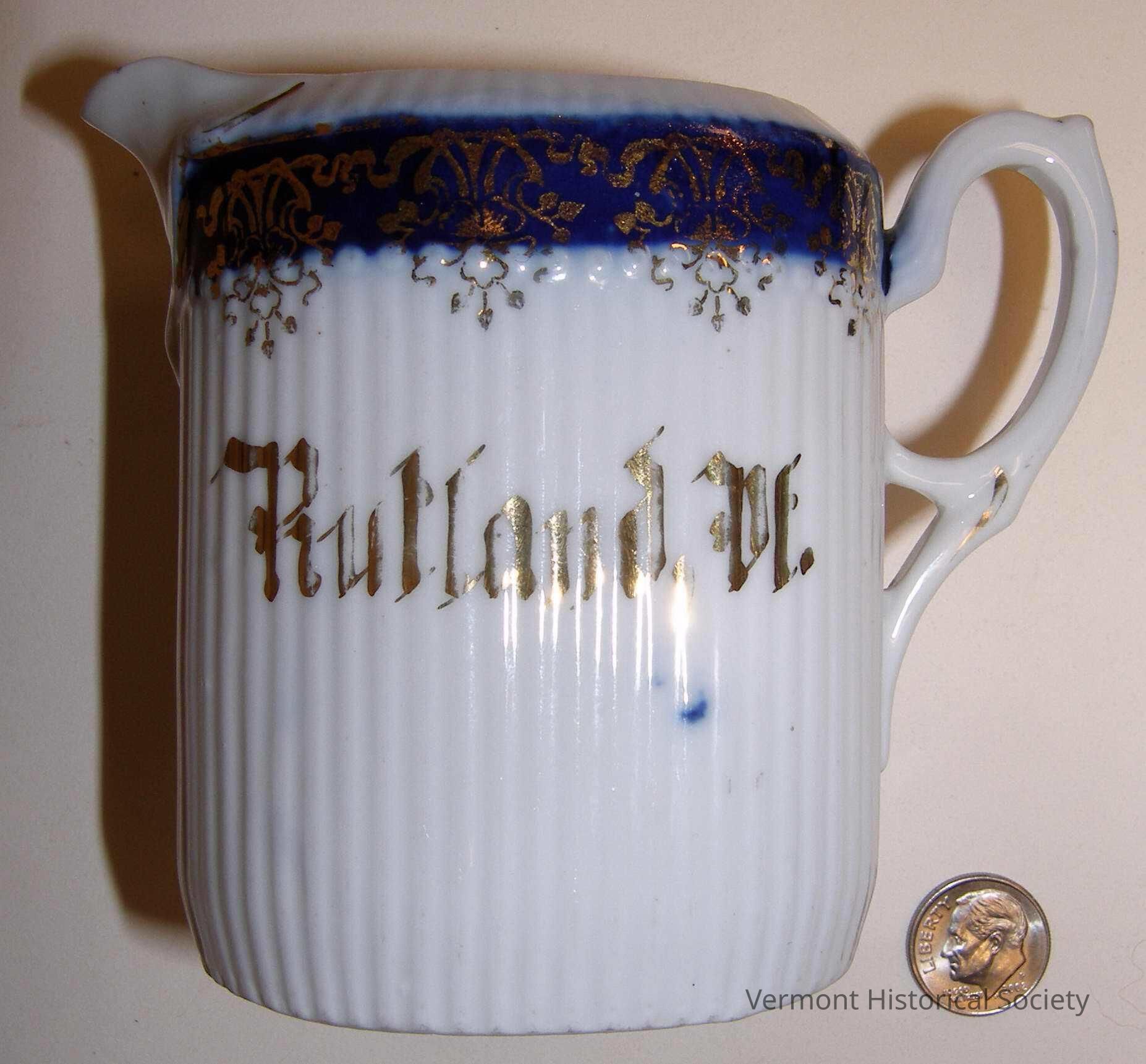 White fluted porcelain cream pitcher with a line of blue glaze and decorative floral gilding around the upper rim. One side has the gilded inscription, "Rutland, Vt." in gothic lettering.