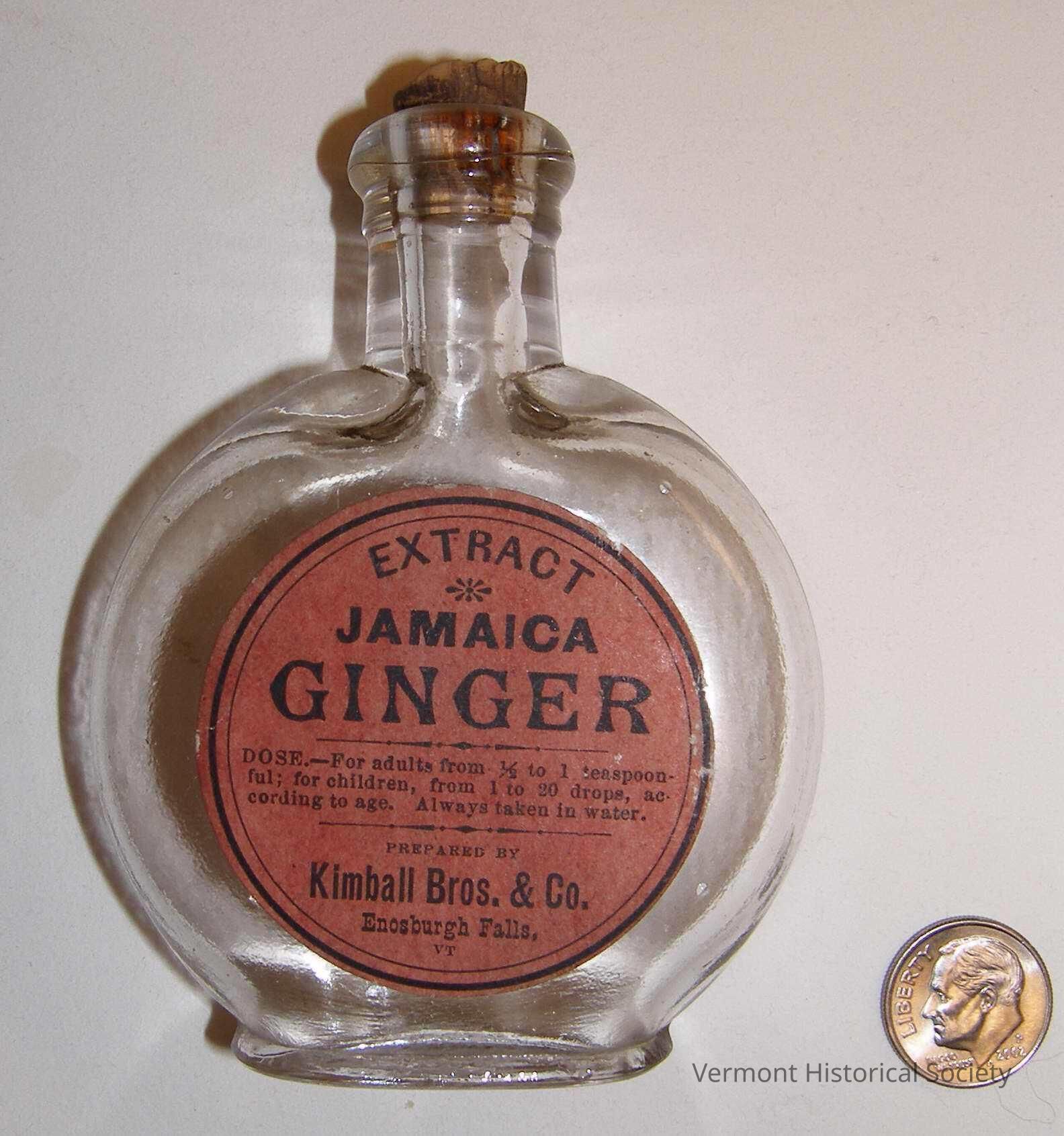 Small round bottle stoppered with a cork. The front has a pink paper label that reads, "EXTRACT JAMAICA GINGER" along with directions for use.