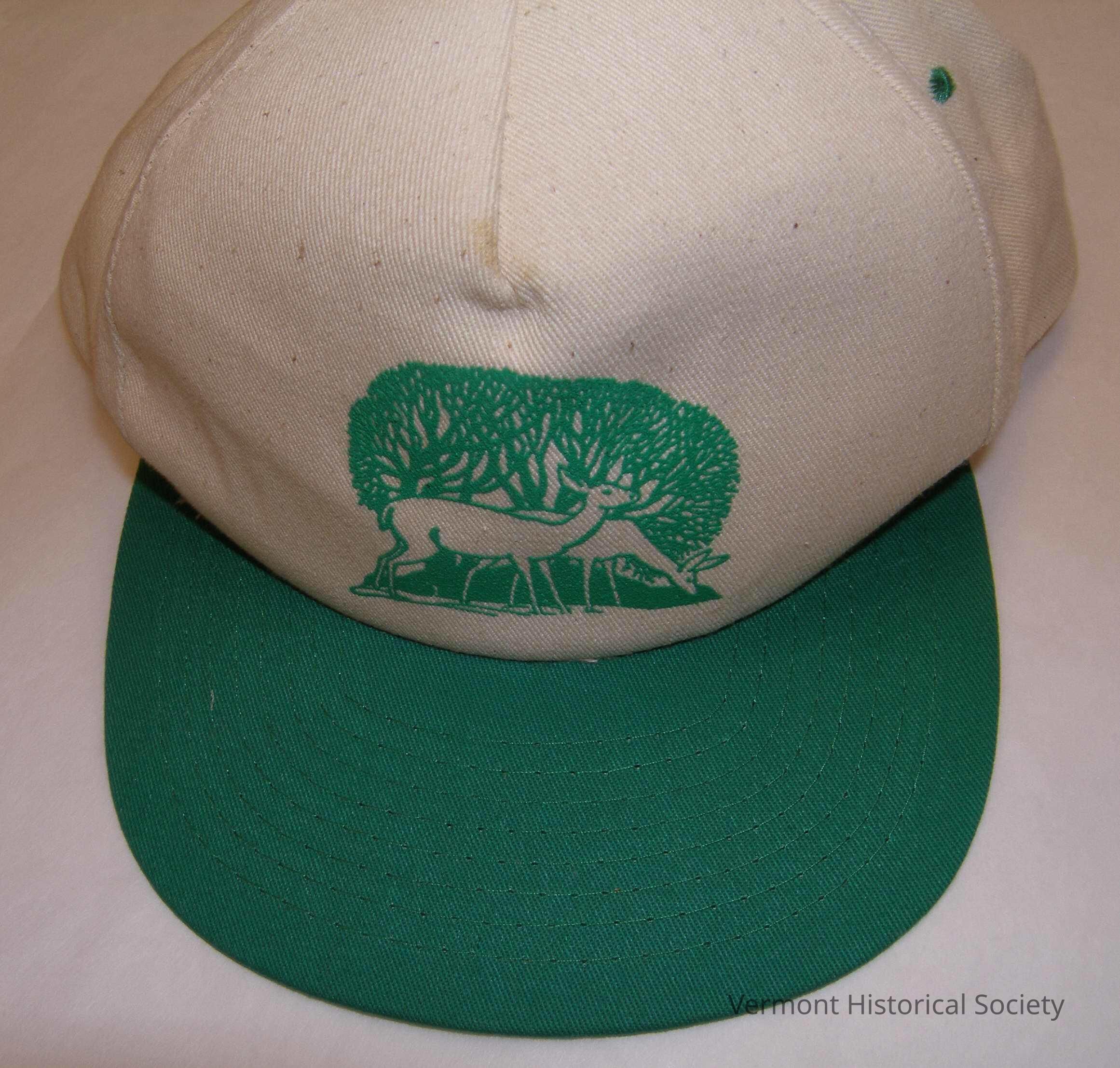 Baseball cap with an undyed cotton crown and green visor. The crown is printed at the center front with an illustration of two deer in front of a copse of leafless trees. A tag on the interior reads, "One Size Fits All Made in China". The initials "A H W" are written on the inside in ink. There is a green plastic tag at the center back for adjusting fit. There are 4 eyelets in the crown, stitched with green thread, and a matching green-fabric covered button at the center top. There are 8 rows of topstitching on the visor, following the shape of the edge.Context
