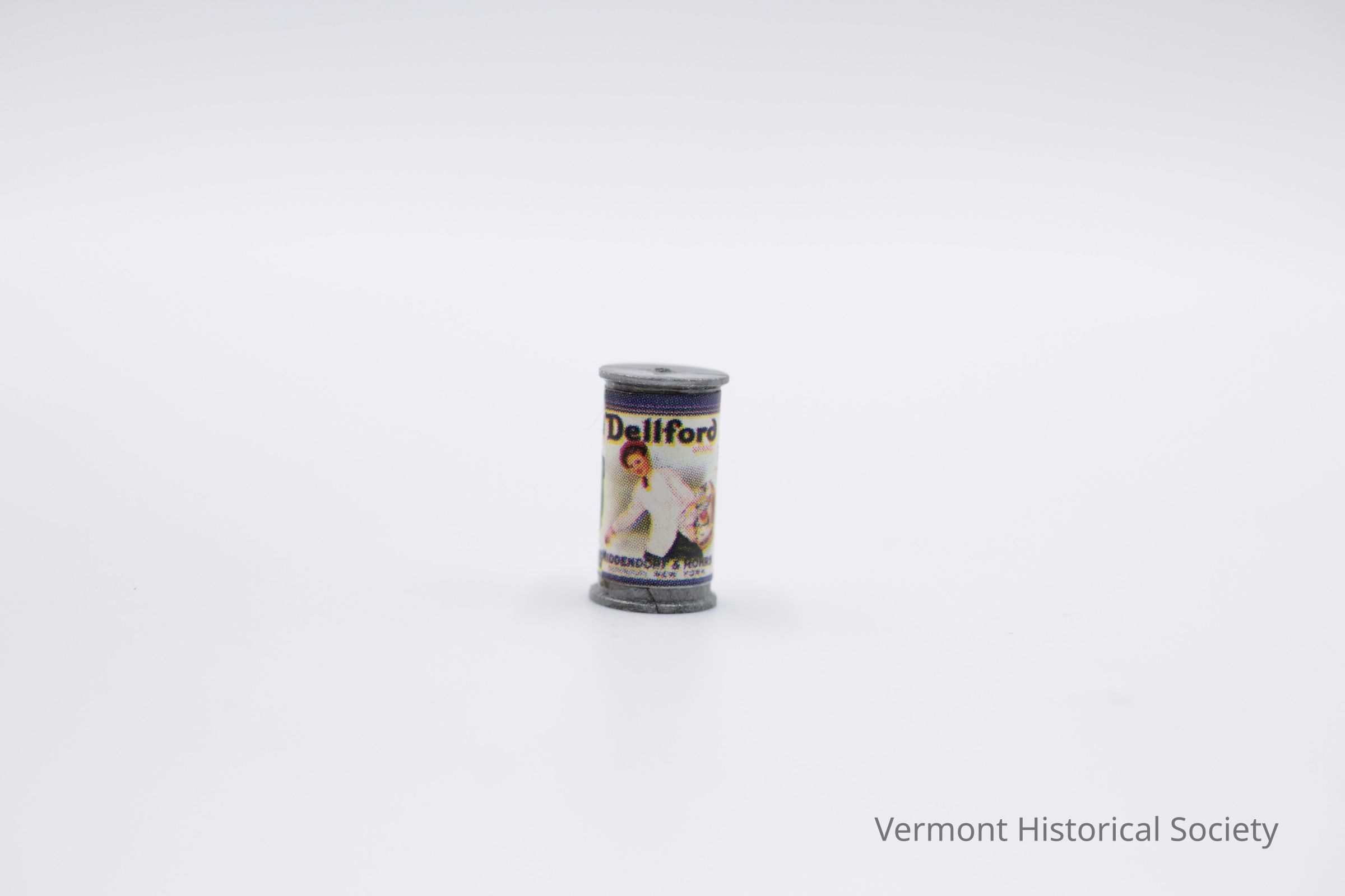 Miniature cylindrical food-storage can. The can is made of silver-colored plastic and is wrapped with a printed paper label. One side of the paper label shows a woman in a shop uniform with the word "Dellford". The other side shows two green plums with the words, "DELLFORD GREEN GAGE PLUMS".Context