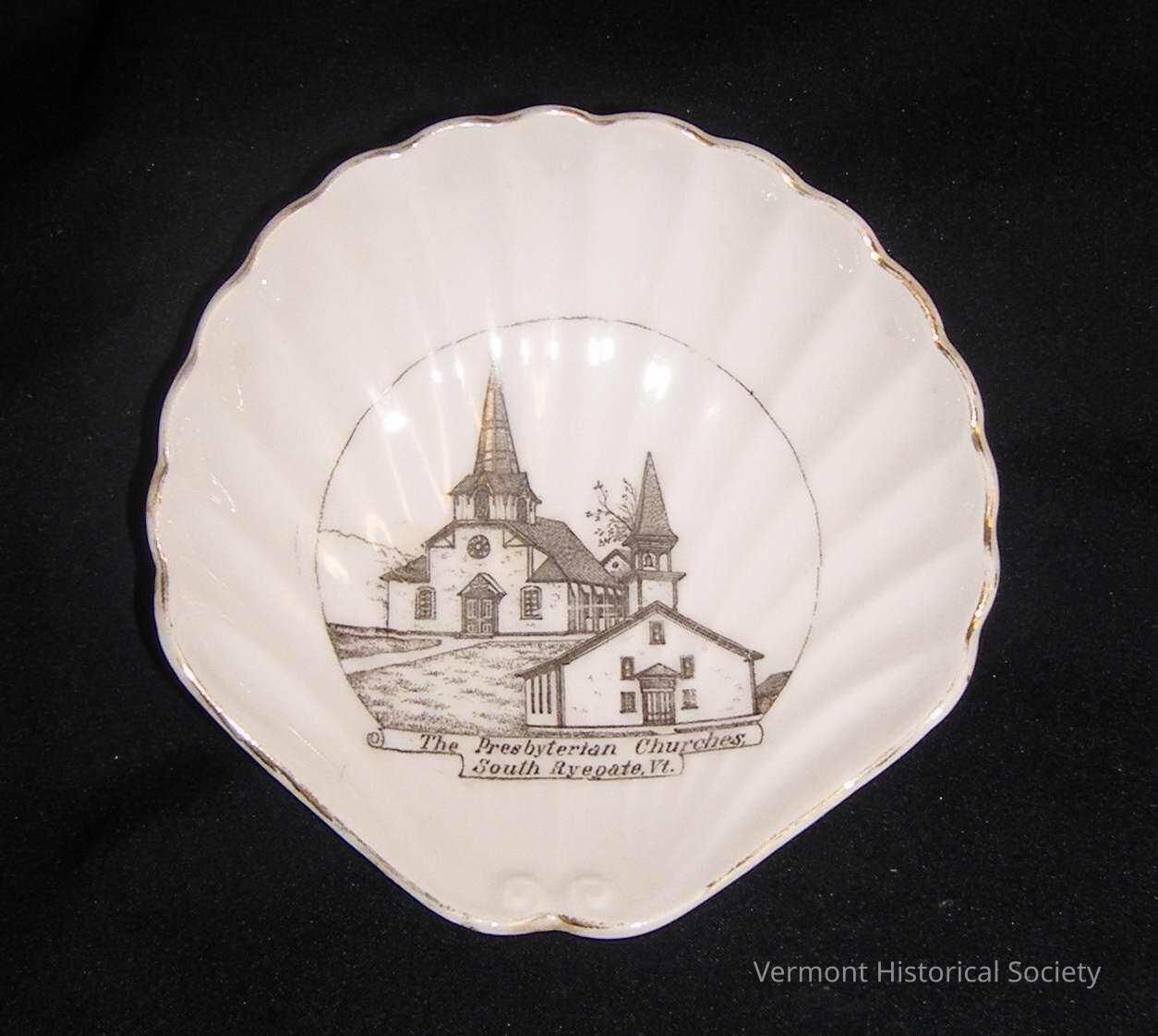 Shallow white ceramic dish shaped like a scallop shell. The center is printed with an illustration of two churches labeled, "The Presbyterian Churches, South Ryegate, Vt." The bottom is marked, "Made in Germany for B. L. TERRY South Ryegate, Vt."Context