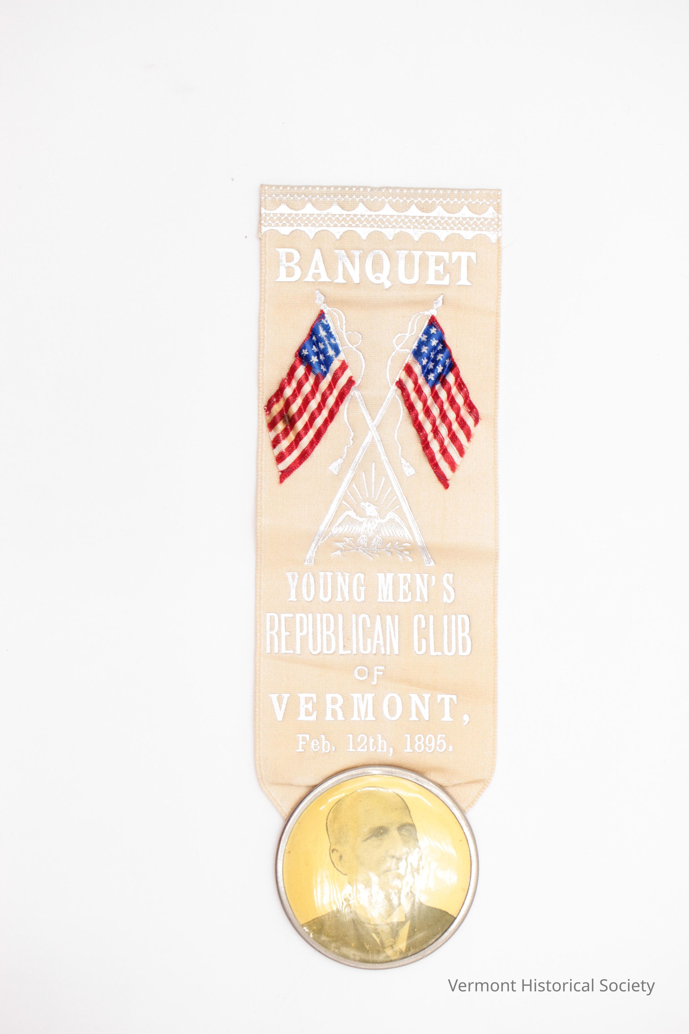 Cream-colored satin-woven ribbon printed in silver with the inscription, "BANQUET / YOUNG MEN'S REPUBLICAN CLUB OF VERMONT, Feb. 12th, 1895." A design of two flag poles crossing over a spread eagle is printed at the center. Two small ribbons woven to look like small United States flags are appliqued onto the ribbon attached to the flag poles. They are appliqued with permanent wrinkles to look like they're waving in the wind. The top edge of the ribbon is folded down over a long stickpin. Attached to the bottom of the ribbon is a round medallion printed with a photograph of a bald man with sideburns (Chauncey M. Depew).