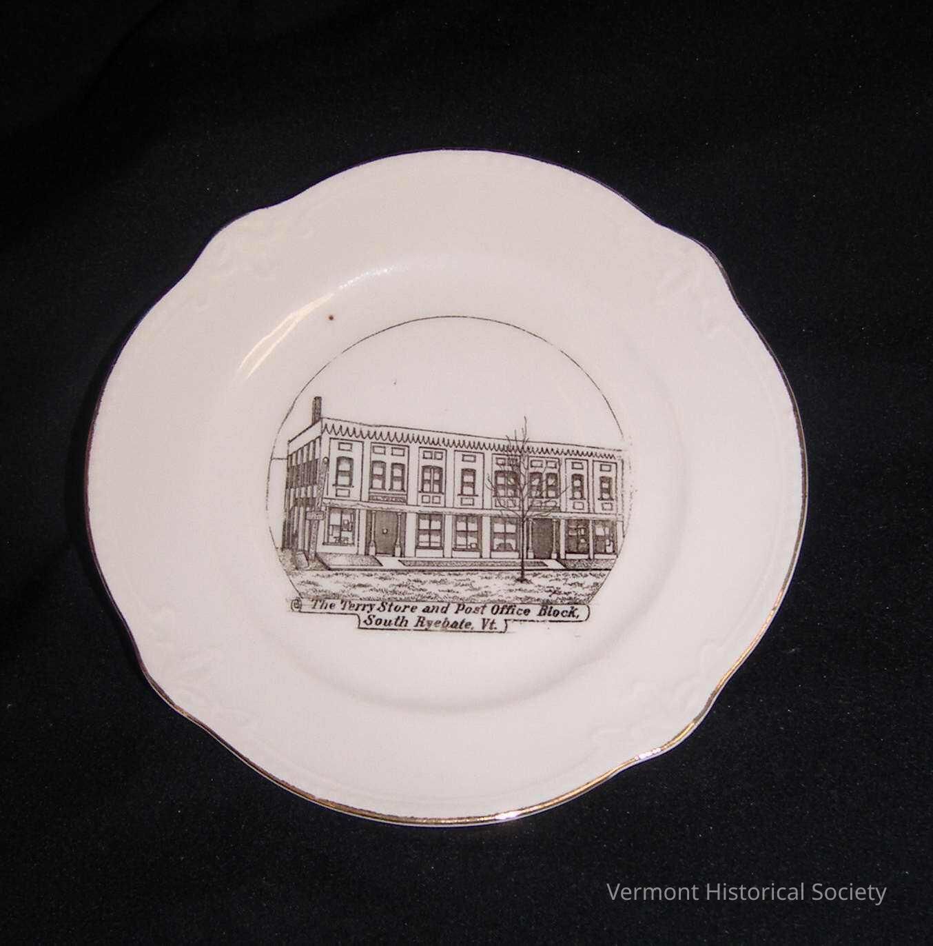 White ceramic saucer printed in the center with a line drawing of a city block of commercial buildings. The image is labeled, "The Terry Store and Post Office Block, South Ryegate, Vt." The bottom is marked, "Made in Germany for B. L. TERRY, South Ryegate, Vt."Context