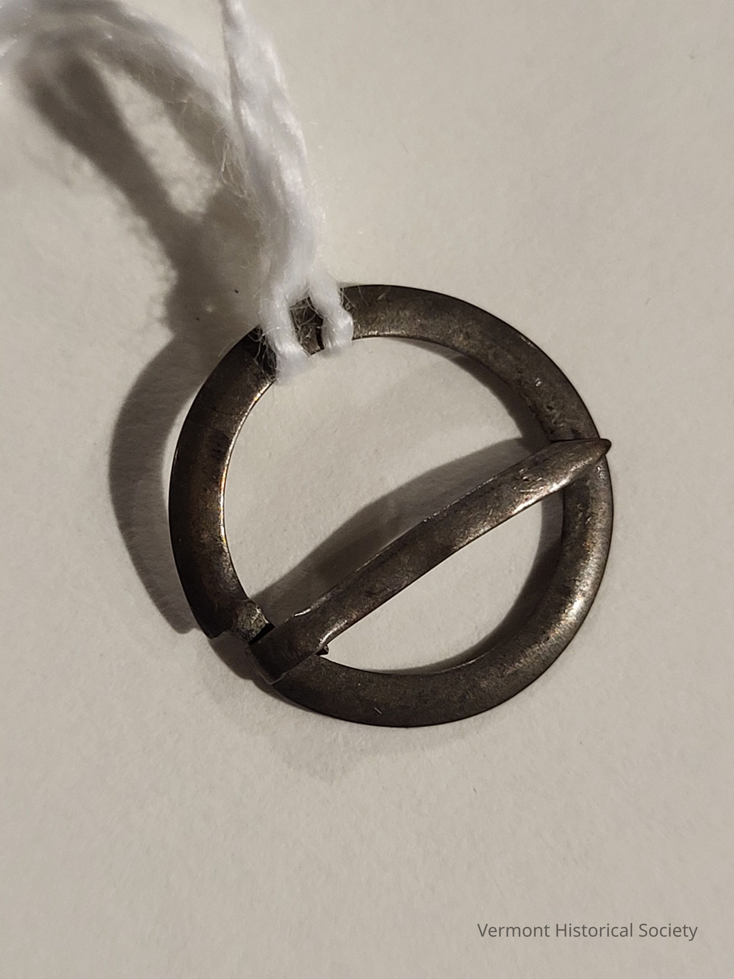 Small ring brooch. The brooch comprises a slightly curved metal ring with a notched section on one outer edge to secure a pin that has been wrapped around the thinned part.