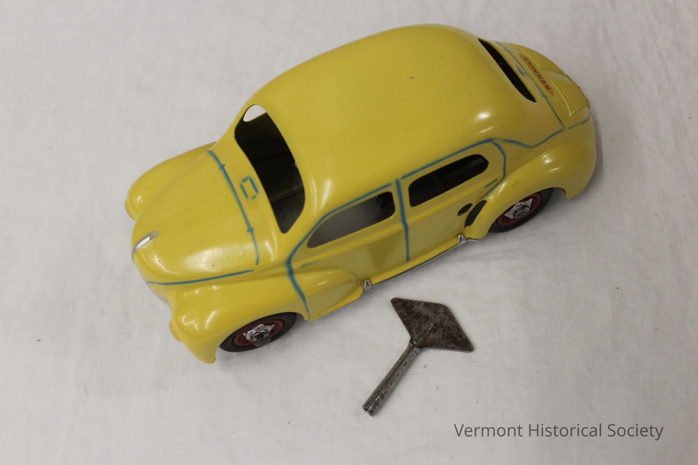 A windup metal toy Renault car, with rubber ties, a hole for a key, a switch to turn the front wheels, a painted license plate that says "Renault" and another diamond emblem on the back right that reads "4CV." This one is yellow with blue outline and has a key.Acquisition
