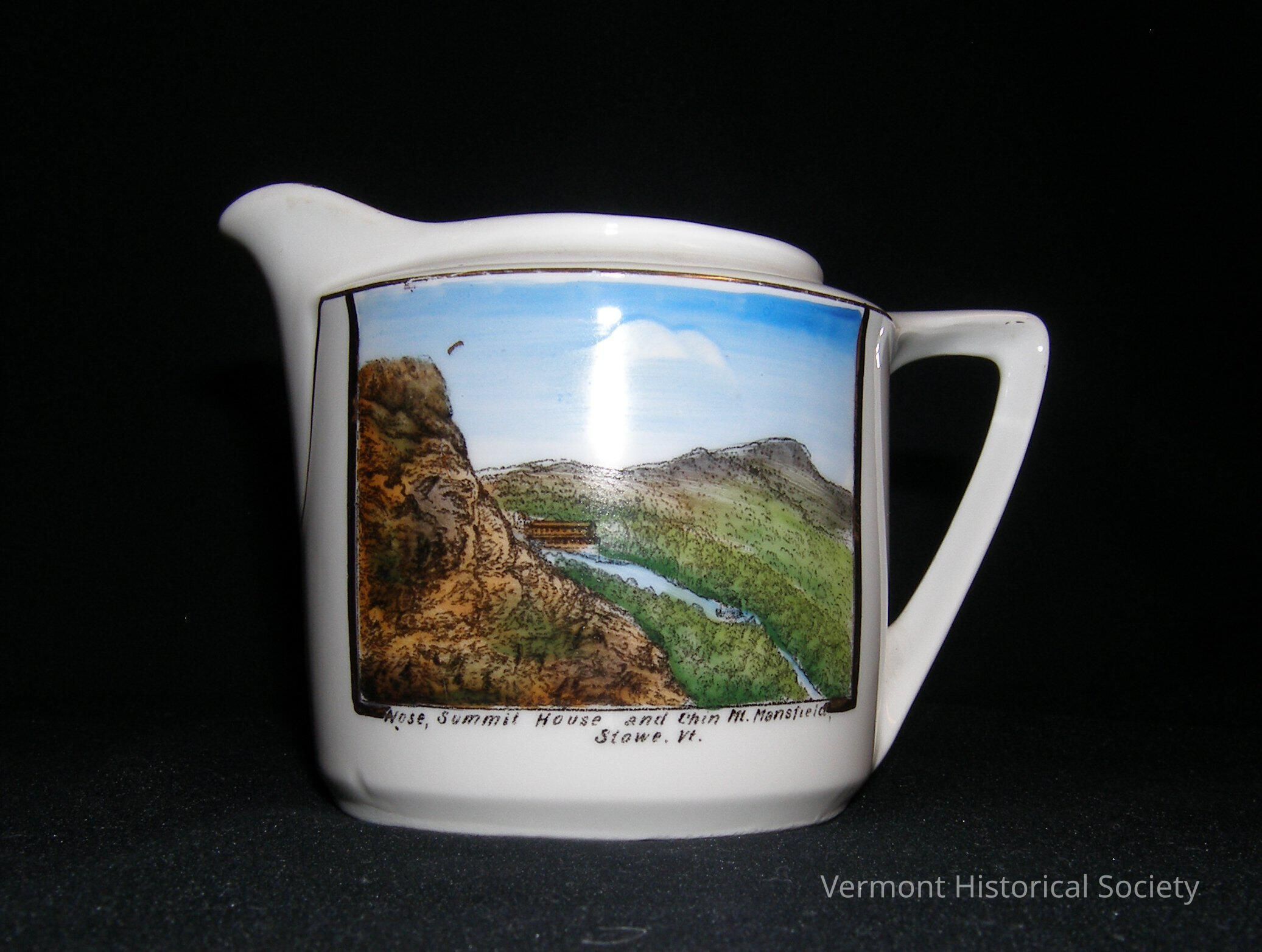 White ceramic cream pitcher printed with a full-color illustration of a an aerial view of a river running through a valley. A rocky cliff rises in the foreground at the left of the image. The image is labeled, "Nose, Summit House and Chin, Mt. Mansfield, Stowe, Vt." The bottom of the pitcher is marked, "Made in Germany for Mt. Mansfield Hotel Co., Stowe, Vermont".Context