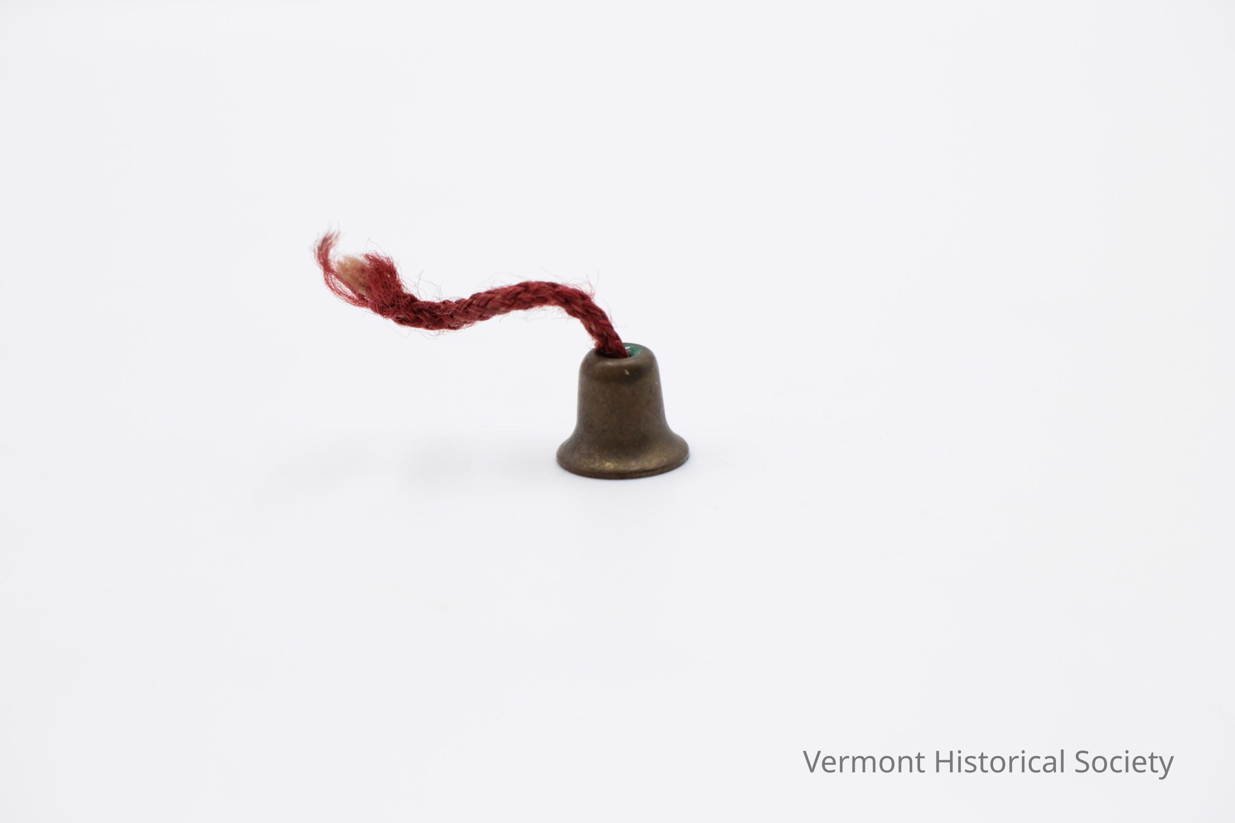 Miniature bell sized for use in a dollhouse. The bell is metal and there is no clapper. There is a red plaited cord extending from the center top of the bell.Context