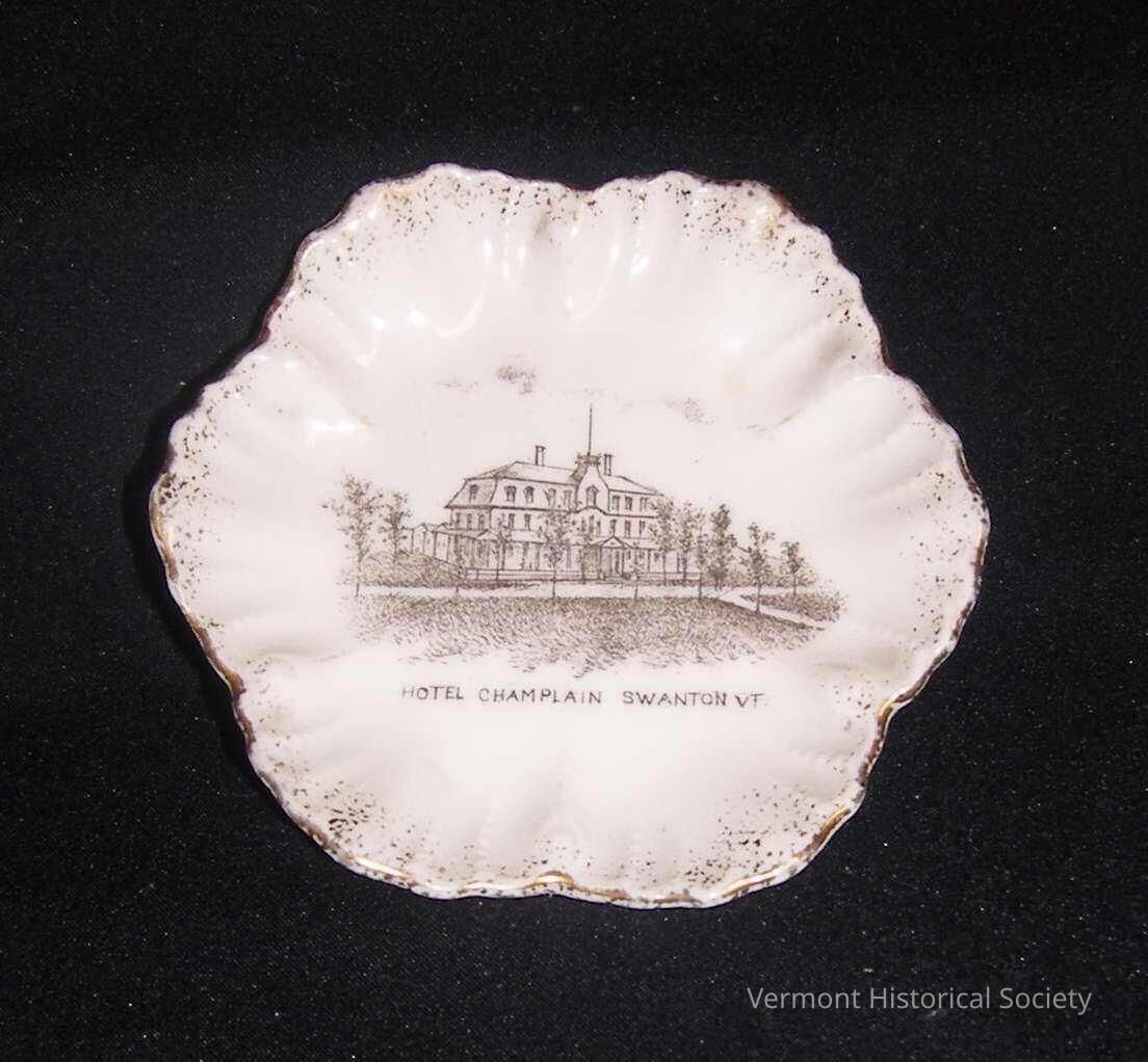 White ceramic cup plate with petaled edge printed with an illustration of a large building with a wraparound porch. The image is labeled, "LAKE CHAMPLAIN SWANTON VT." The bottom of the dish is marked, "B. F. H. S. CHINA MADE IN AUSTRIA for H. C. BARNES Swanton Vt."