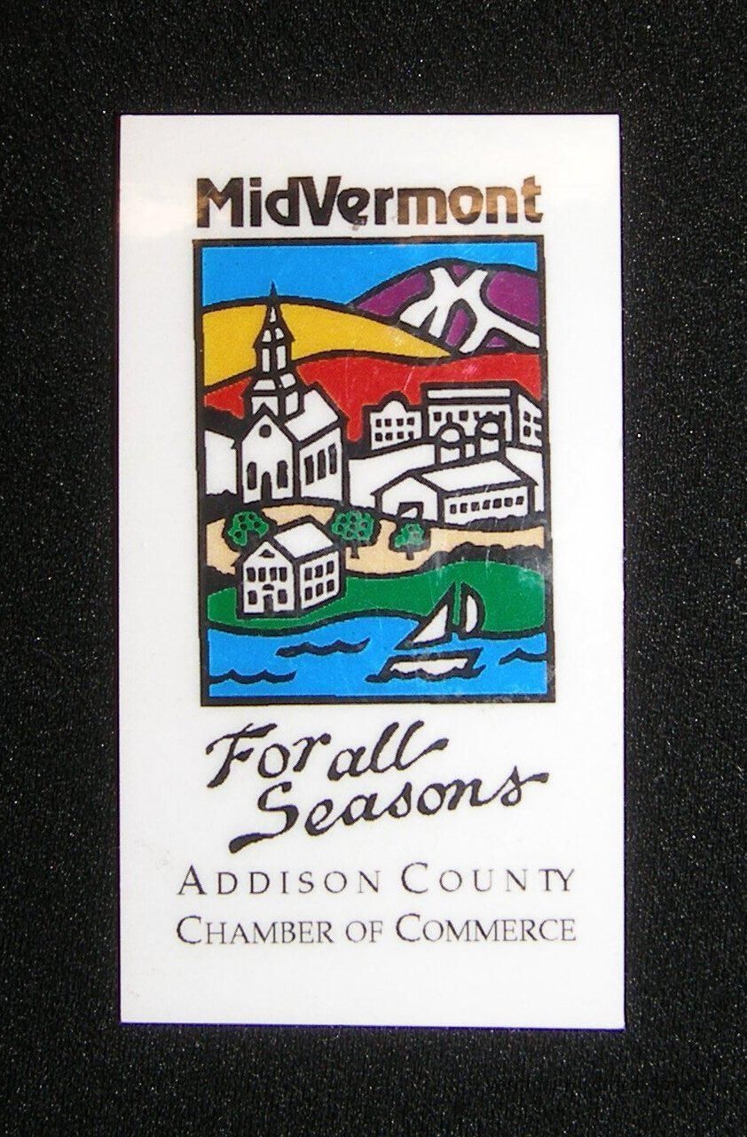 White, rectangular plastic magnet with a simplistically drawn scene of a city within rolling hills, with water in the foreground, and ski trails in the background. Above the image is the word, "MidVermont", and below is the inscription, "For all Seasons Addison County Chamber of Commerce."
