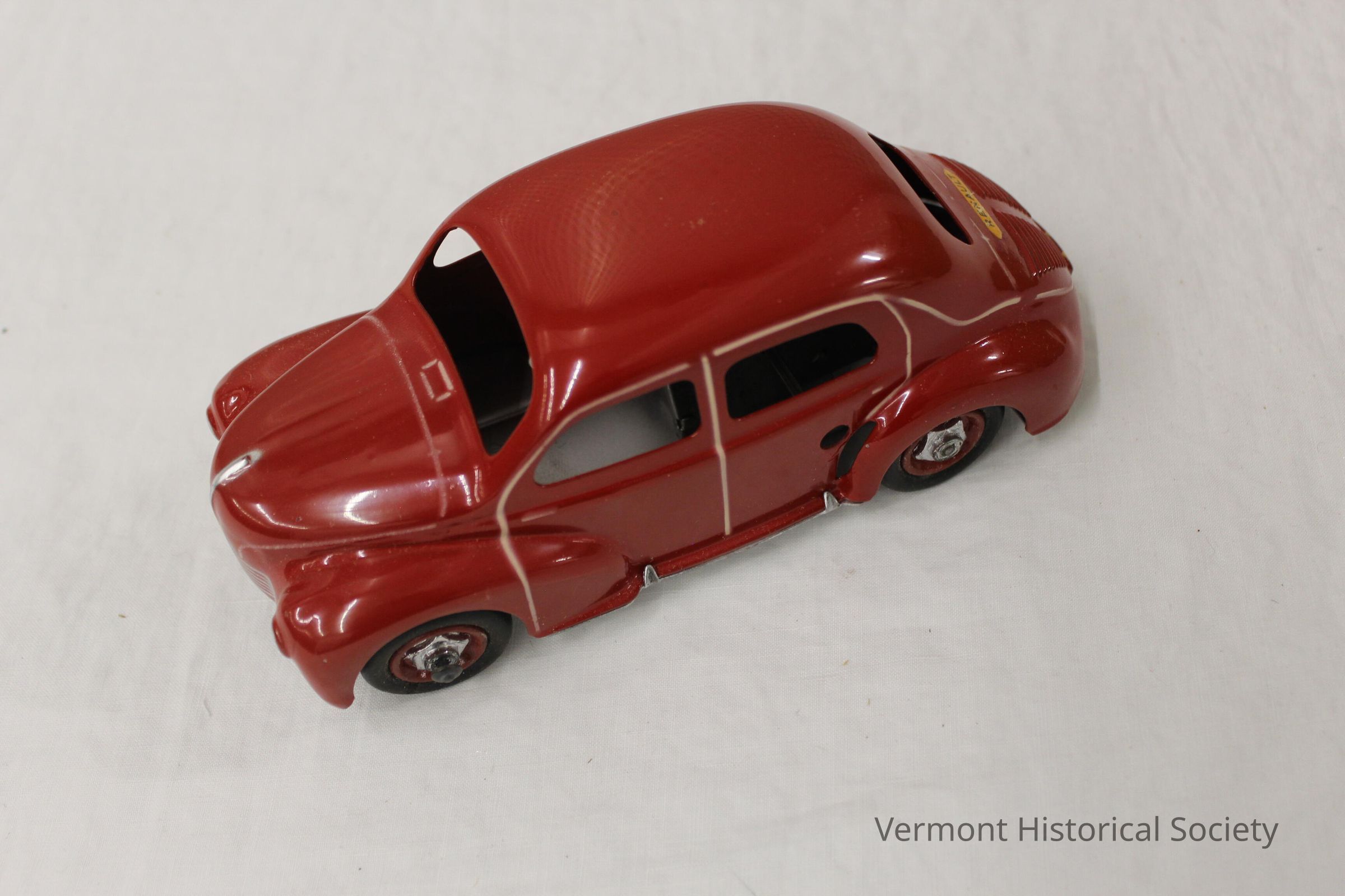 A windup metal toy Renault car, with rubber ties, a hole for a key, a switch to turn the front wheels, a painted license plate that says "Renault" and another diamond emblem on the back right that reads "4CV." This one is red with white outline and doesn't have a key.Context