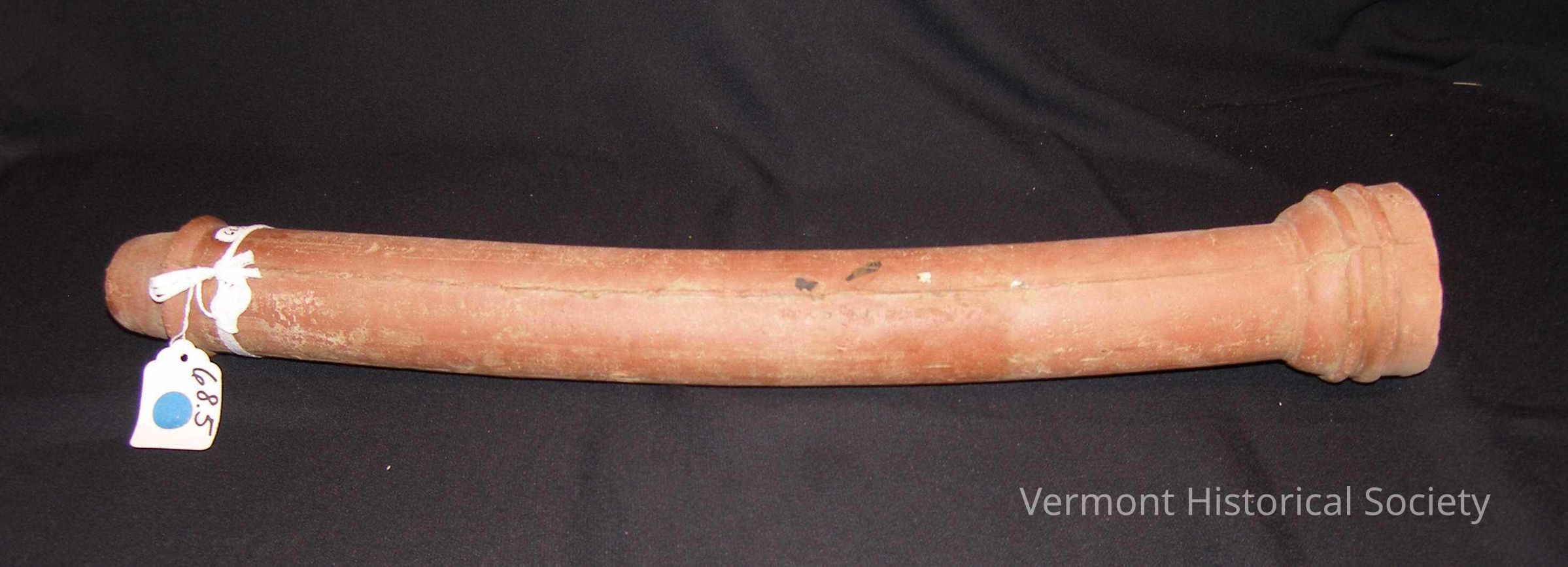 Red ceramic water pipe. The pipe has a male attachment on one end, which narrows and rounds inward to fit inside another pipe, and a female attachment on the other end, which widens to fit around another pipe.