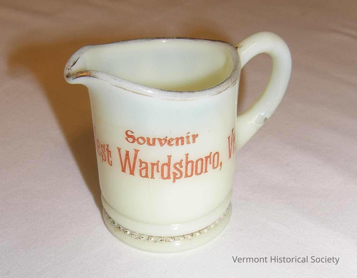 Miniature custard glass pitcher. The pitcher is painted with gold paint on the upper edge around the beading at the base. The center has the printed inscription, "Souvenir West Wardsboro, Vt."