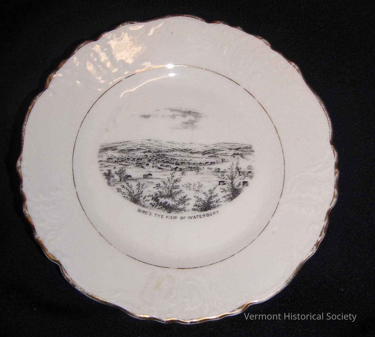 White ceramic saucer printed at the center with an illustration of a valley seen from above. The image is labeled, "BIRD'S EYE VIEW OF WATERBURY". The bottom is marked MADE IN GERMANY H. C. WHITEHILL WATERBURY, VT".Context