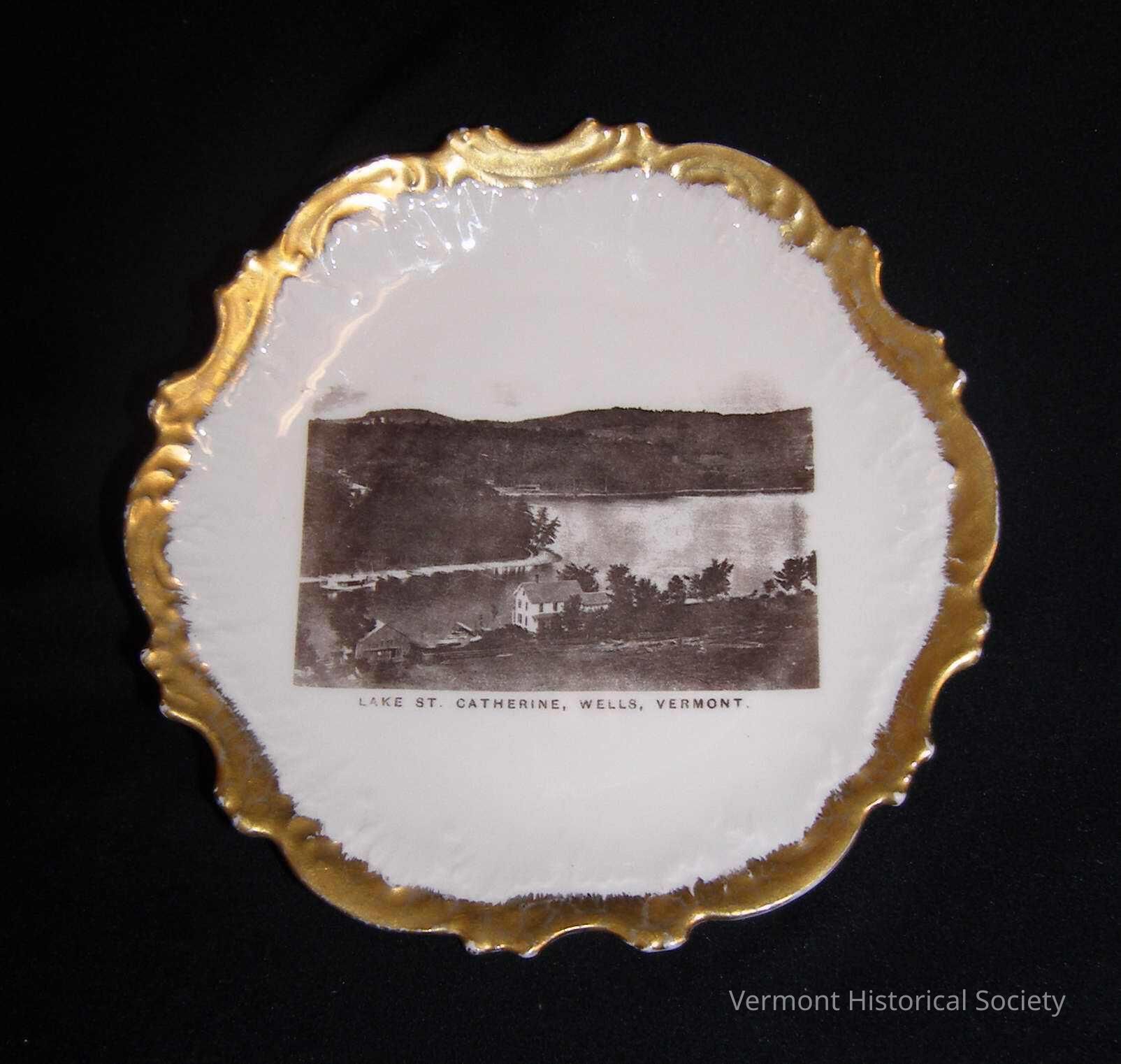 White ceramic saucer with heavily gilded edge. The saucer is printed in the center with a rectangular illustration of a white house on the side of a lake. The image is labeled, "LAKE ST. CATHERINE, WELLS, VERMONT." The bottom of the dish is marked, "MADE IN GERMANY O. OFFENHAEUSER, JEWELER, GRANVILLE, N. Y."Acquisition