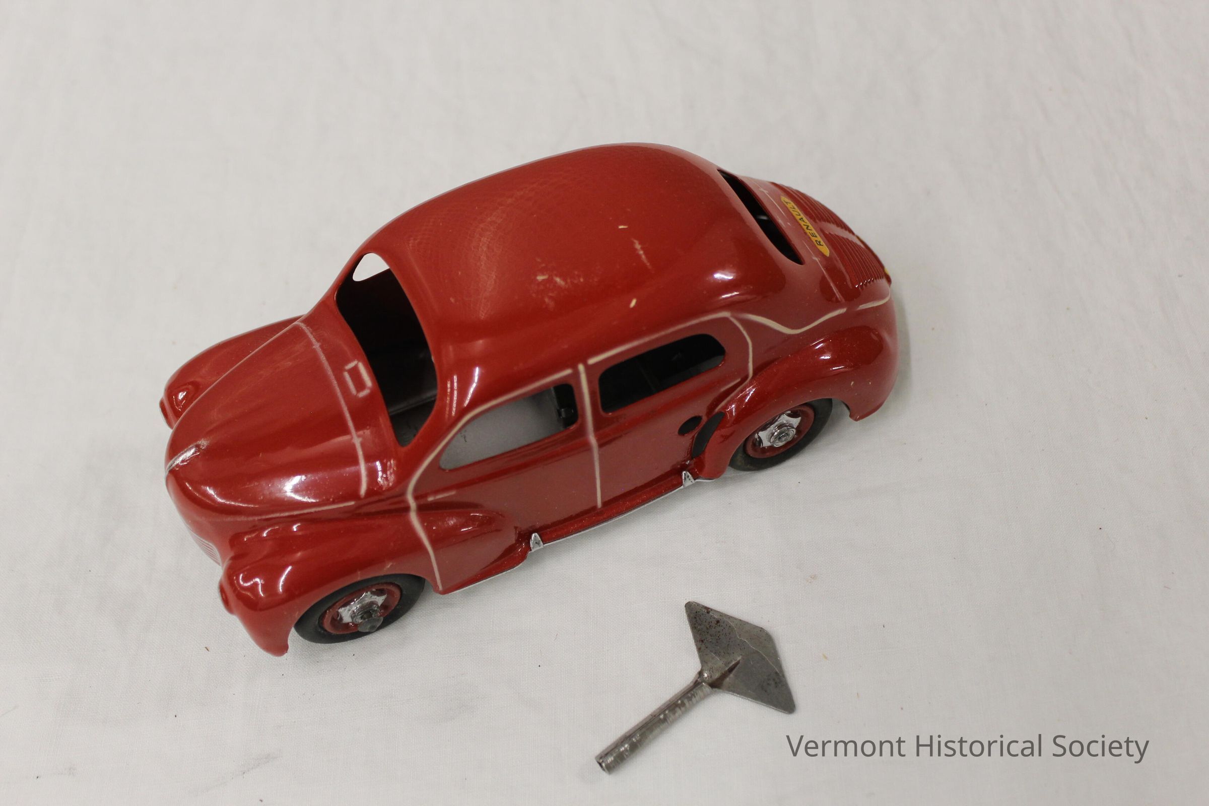 A windup metal toy Renault car, with rubber ties, a hole for a key, a switch to turn the front wheels, a painted license plate that says "Renault" and another diamond emblem on the back right that reads "4CV." This one is red with white outline and has a key.Context