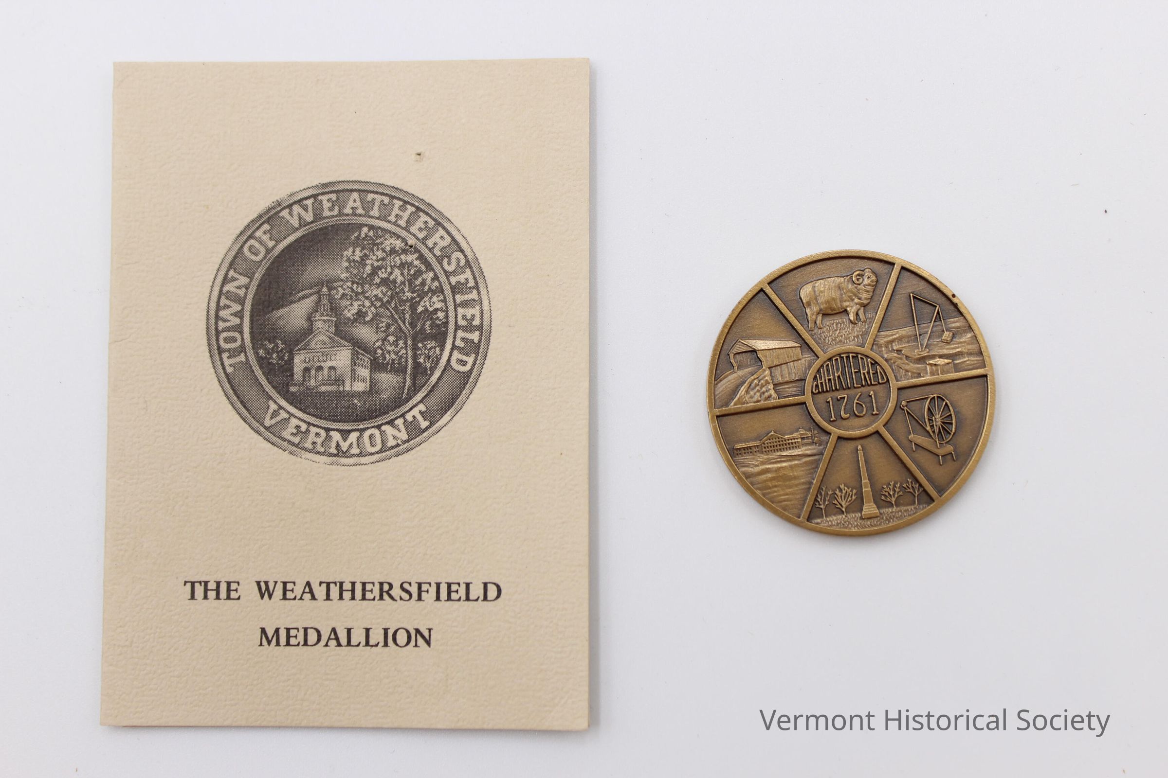 Bronze commemorative medal. One side is molded with a scene of a church in a field with the inscription, "TOWN OF WEATHERSFIELD VERMONT" around the edge. The other side is separated into 6 wedges around a central circle with the inscription, "CHARTERED 1761". Clockwise from top, the wedges show a sheep, a crane pulling granite from a quarry, a spinning wheel, an obelisk, a large 19-bay building, and a covered bridge. The medal is accompanied by a small informational booklet.Context