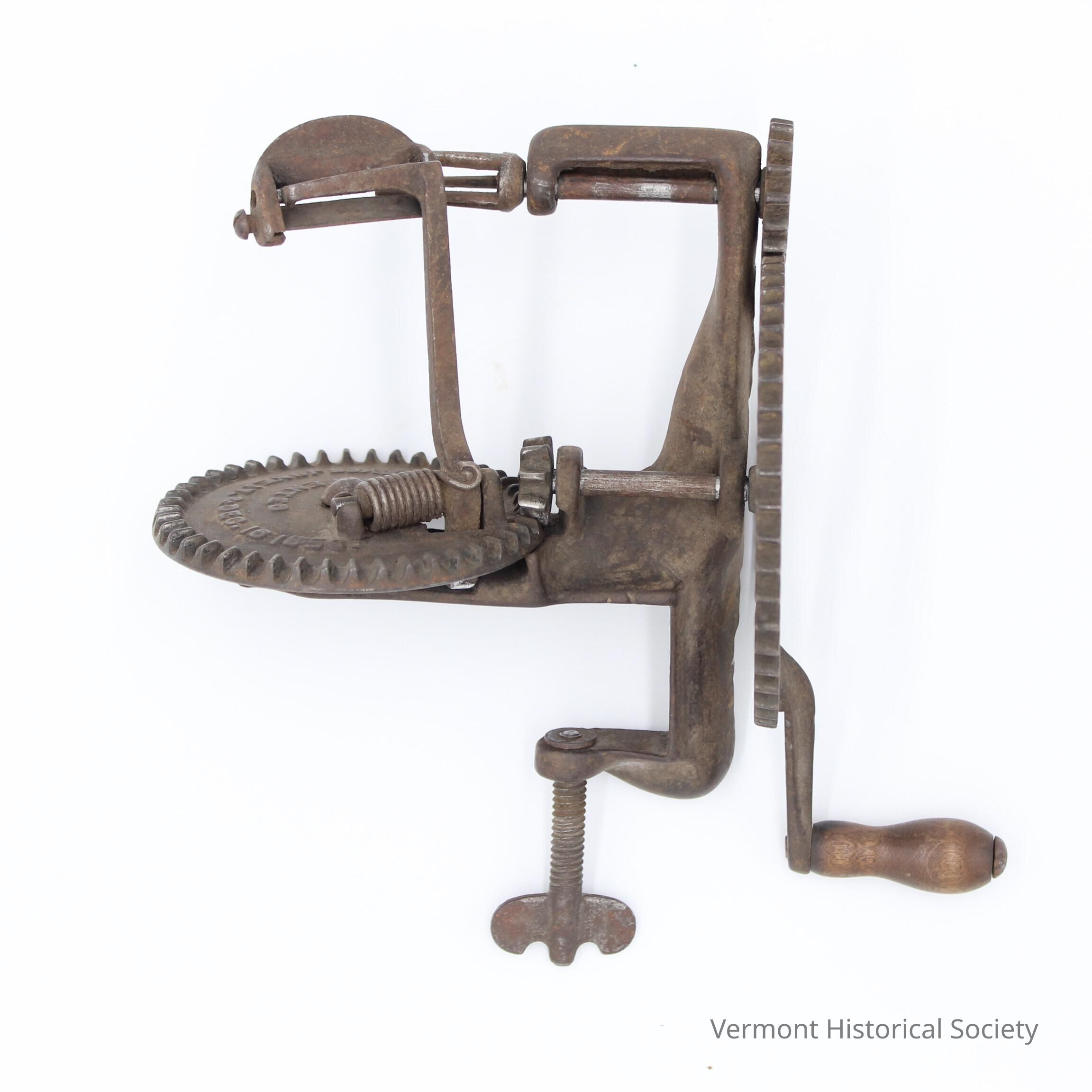 Apples have always been a core food product for Vermont, and many uses of apples require them to be peeled and cored. Introducing a mechanical device to the process speeds things up considerably, reducing the tedium of the task and preserving more of the apple’s flesh. There are dozens of potential variations on mechanical parers, including many homemade variations (see 1972.3.2 in this same exhibition), but this variation, patented by Horatio Keyes in 1856, introduced the idea of moving the paring arm around the apple via a geared turntable, a huge leap forward in speed and convenience.