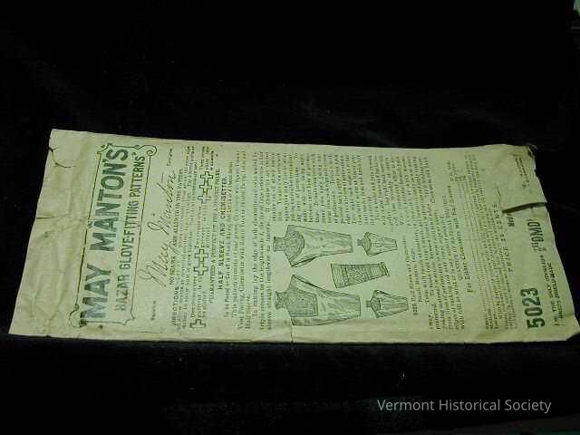 Cut tissue paper sewing pattern in a commercial envelope. The front of the envelope is printed with brand information ("MAY MANTON'S"), sewing instructions, and an illustration of the finished garment. The garment is a false shirt front and detachable undersleeves ("Half Sleeve and Chemisette").