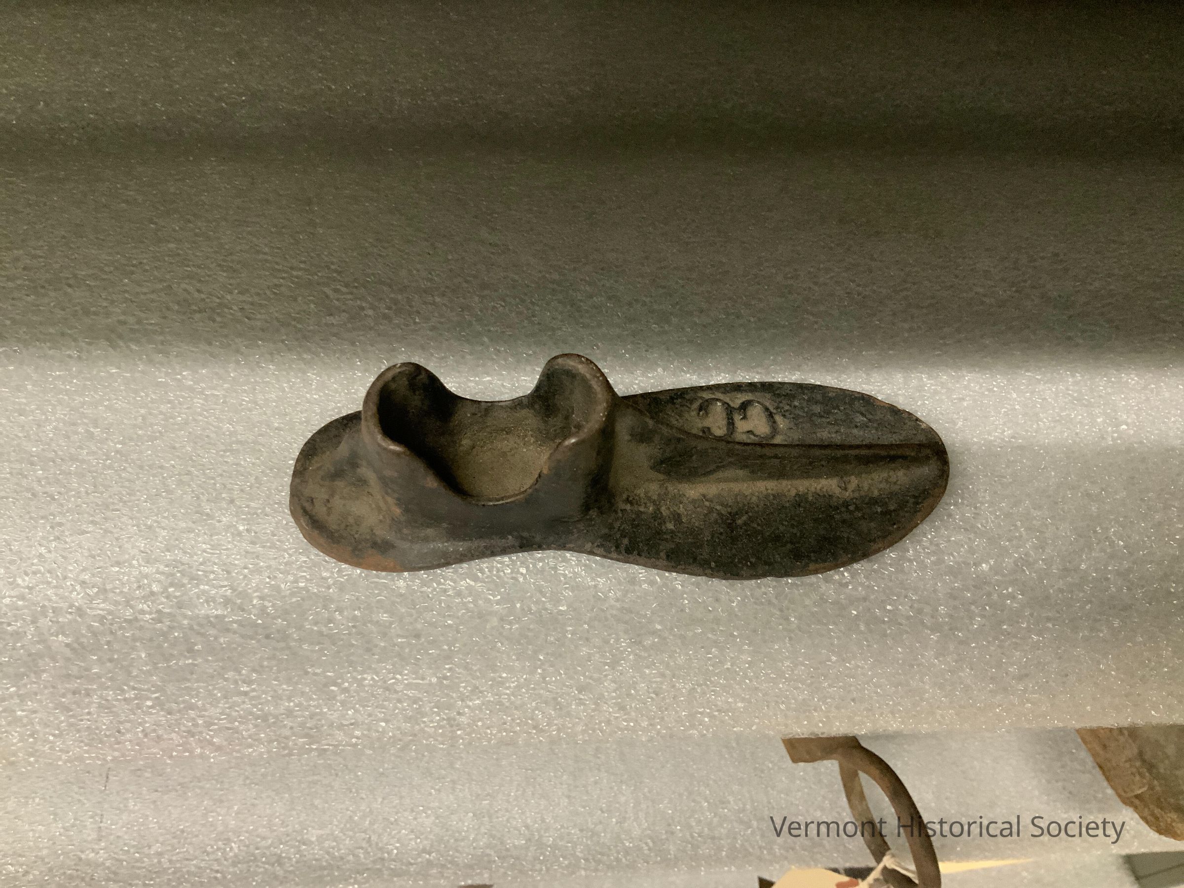 Metal cobbler‘s last sized for a child’s shoe. The upper is molded with the initials CC.
