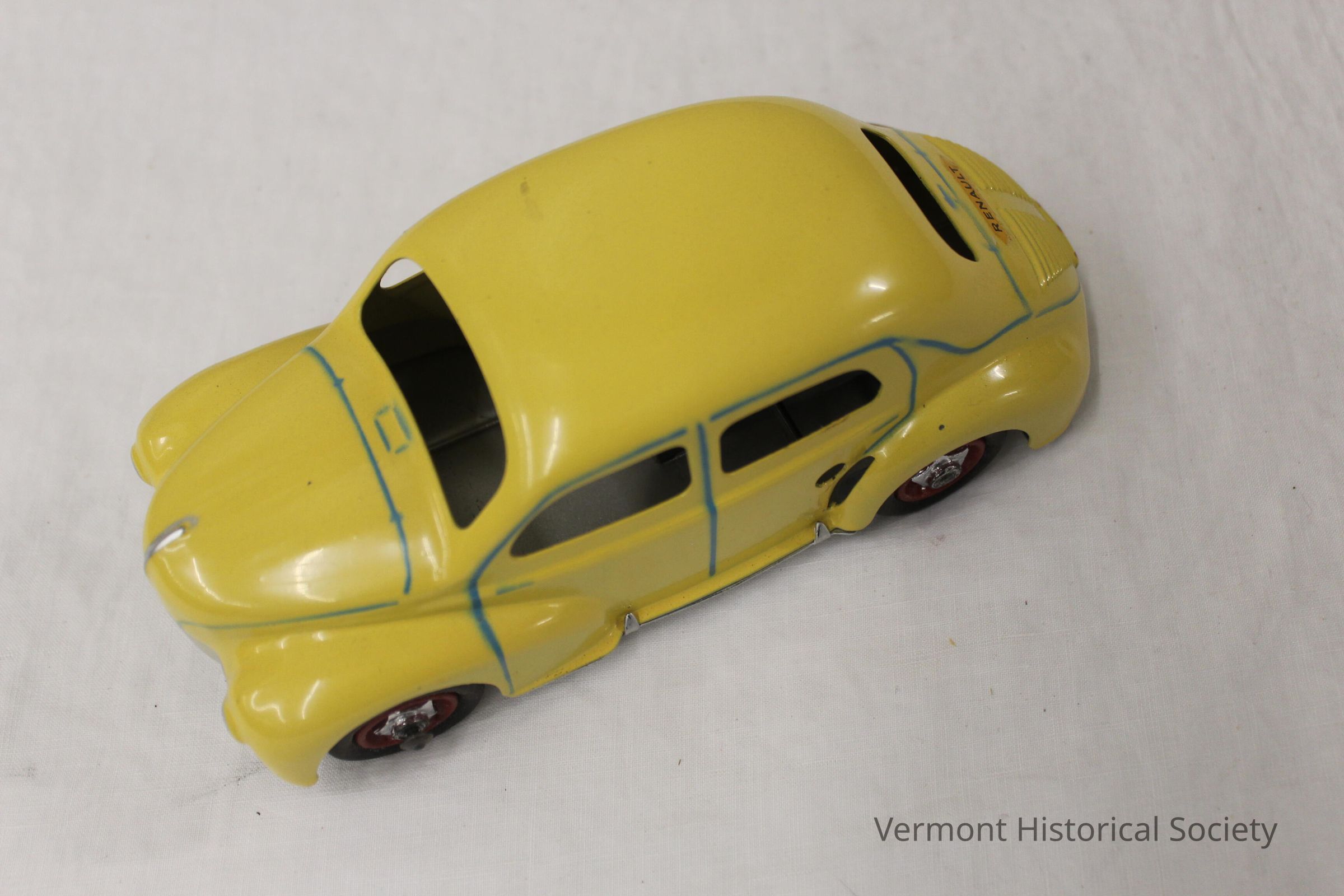 A windup metal toy Renault car, with rubber ties, a hole for a key, a switch to turn the front wheels, a painted license plate that says "Renault" and another diamond emblem on the back right that reads "4CV." This one is yellow with blue outline and has a key.Context