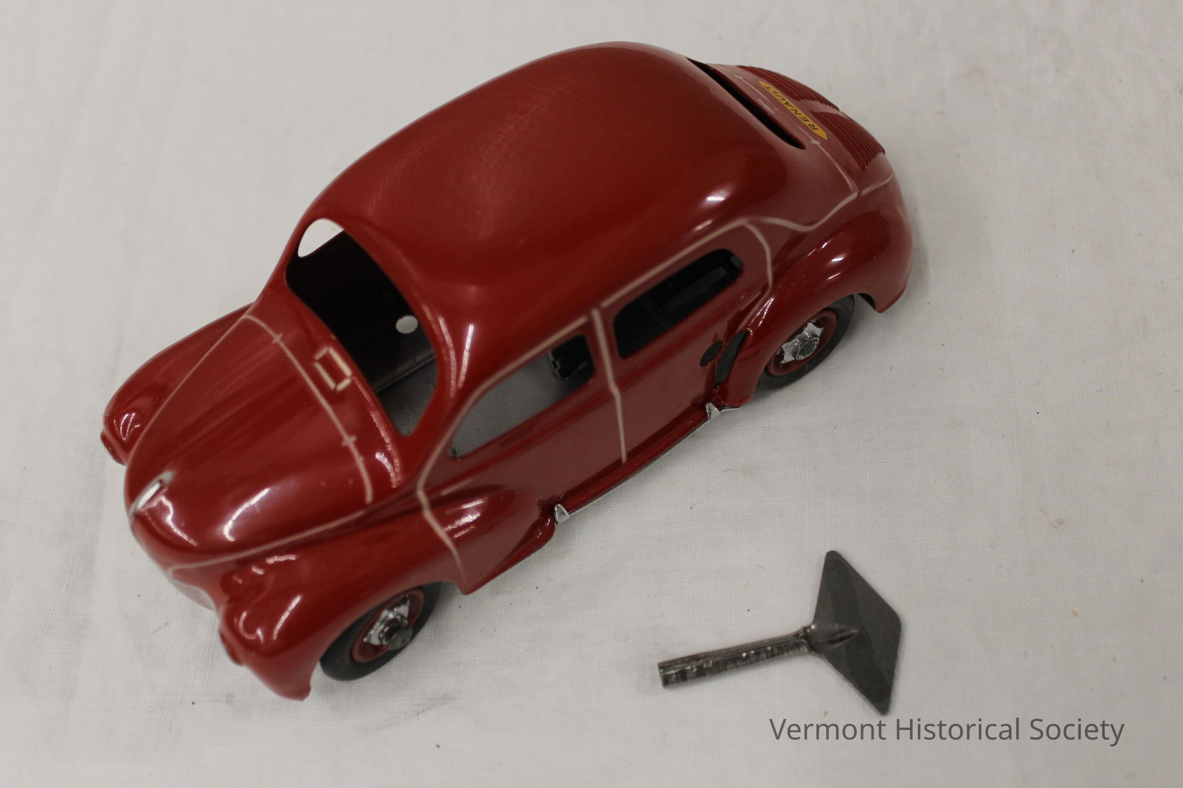 A windup metal toy Renault car, with rubber ties, a hole for a key, a switch to turn the front wheels, a painted license plate that says "Renault" and another diamond emblem on the back right that reads "4CV." This one is red with white outline and has a key.Context
