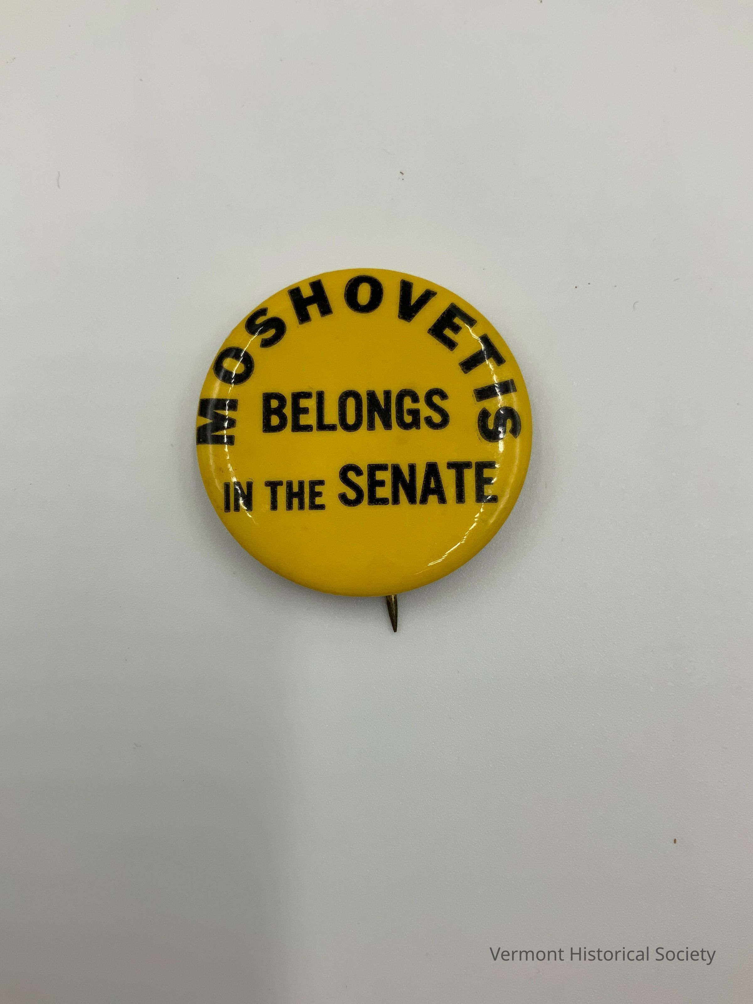Round yellow button with the black inscription, "MOSHOVETIS BELONGS IN THE SENATE".