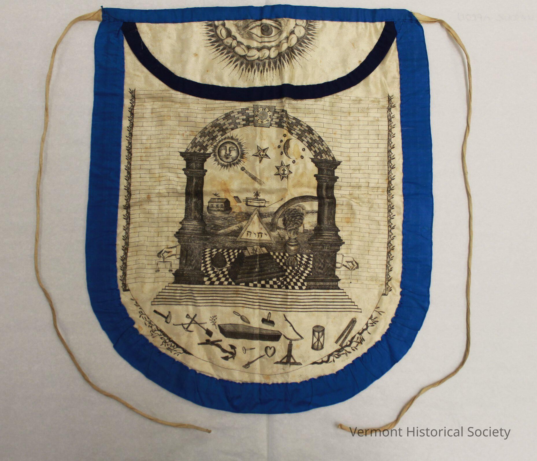 Masonic apron consisting of white interior ground bearing several symbolic Masonic images. The symbols include the all seeing eye, a sun, a moon, the ark, a five-pointed star, a comet, a bush, a scale, the altar of knowledge, an anchor, a coffin, an hourglass, a heart, and various masonry tools. The apron is edged in blue, and the top flap is edged in black.Context