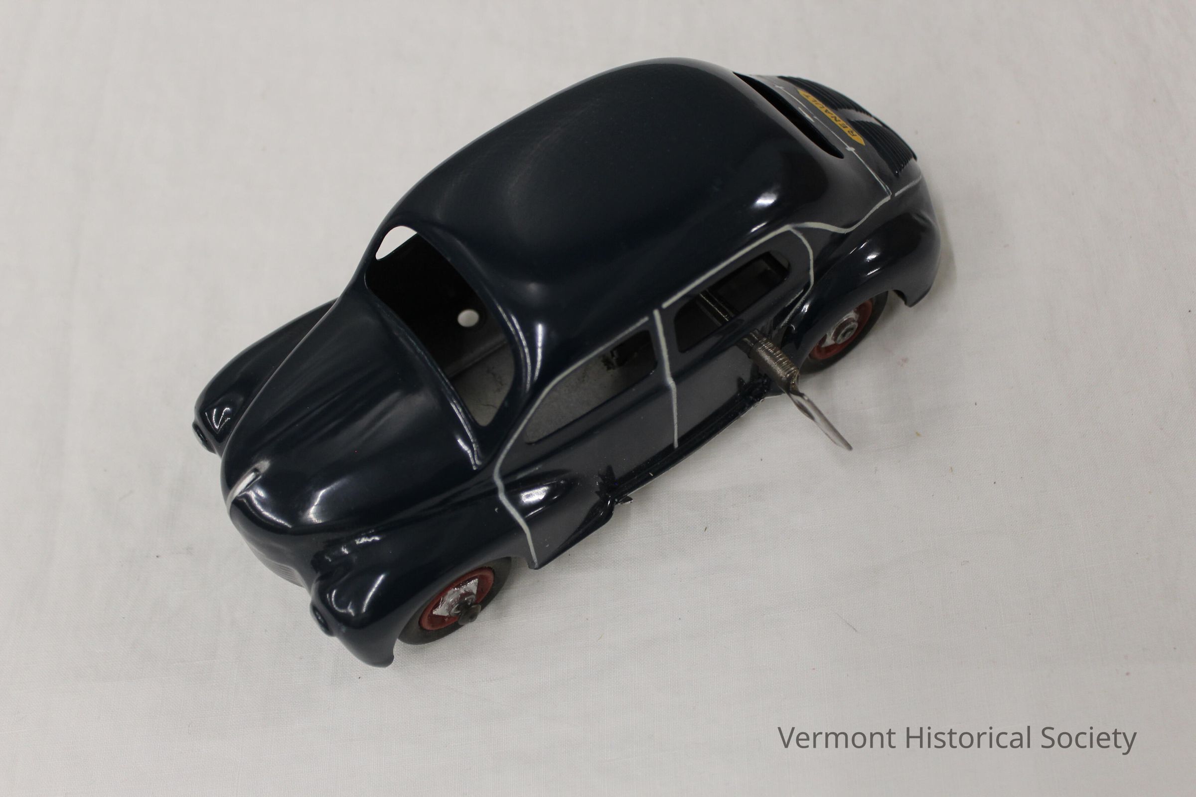 A windup metal toy Renault car, with rubber ties, a hole for a key, a switch to turn the front wheels, a painted license plate that says "Renault" and another diamond emblem on the back right that reads "4CV." This one is navy with white outline and its key is stuck in the turn hole.Context