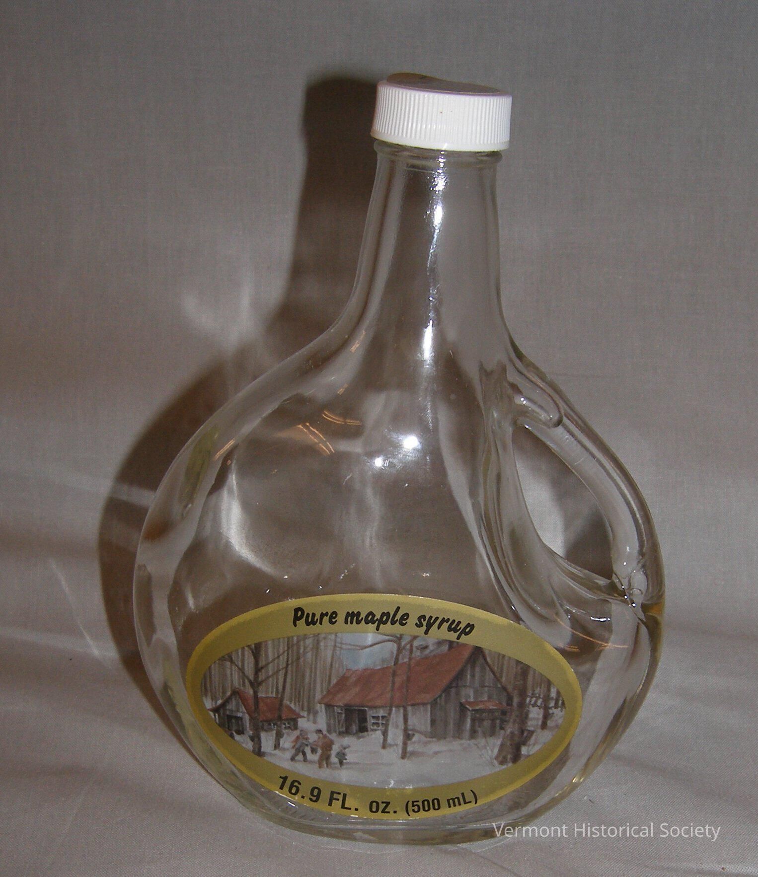 a= Glass maple syrup bottle with handle on right side and paper label on front with sugar house scene, "Pure maple syrup" across top and "16.9 FL. oz. (500 ml)" across bottom.
