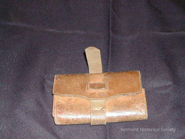 Trifold brown leather wallet. The wallet secures with a long leather strap that extends from the outer flap and wraps around the entire wallet, securing through a tab in the center front.