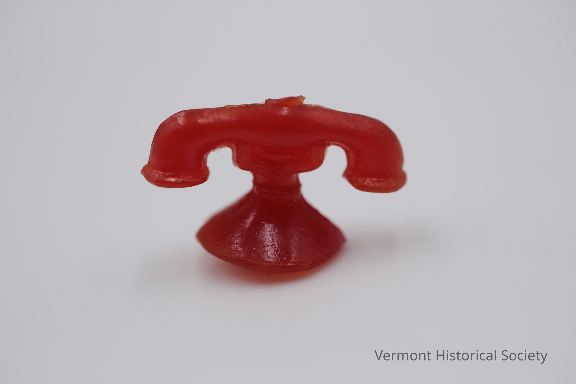 Miniature red plastic telephone. The phone is C-shaped and sits on a round pedestal base.Context