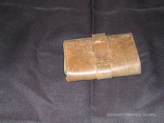 Brown leather envelope style wallet. It secures closed with a long leather strap extending from the center of the outer flap and wraps around the wallets body, then inserts through another strap on the outer flap. The interior of the wallet consists of two envelope-style pockets. One is embossed with the label, "ALL LEATHER".