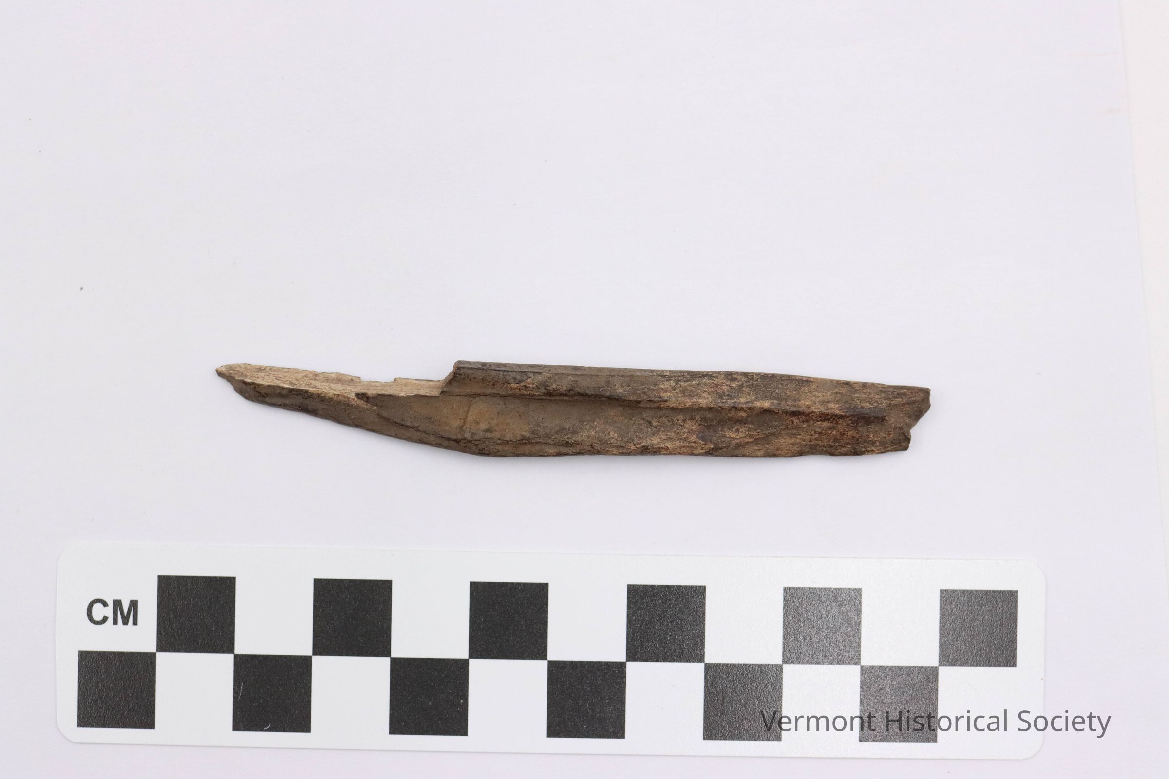 Worked animal bone. It has a polished surface, and the edges are smoothed.Context