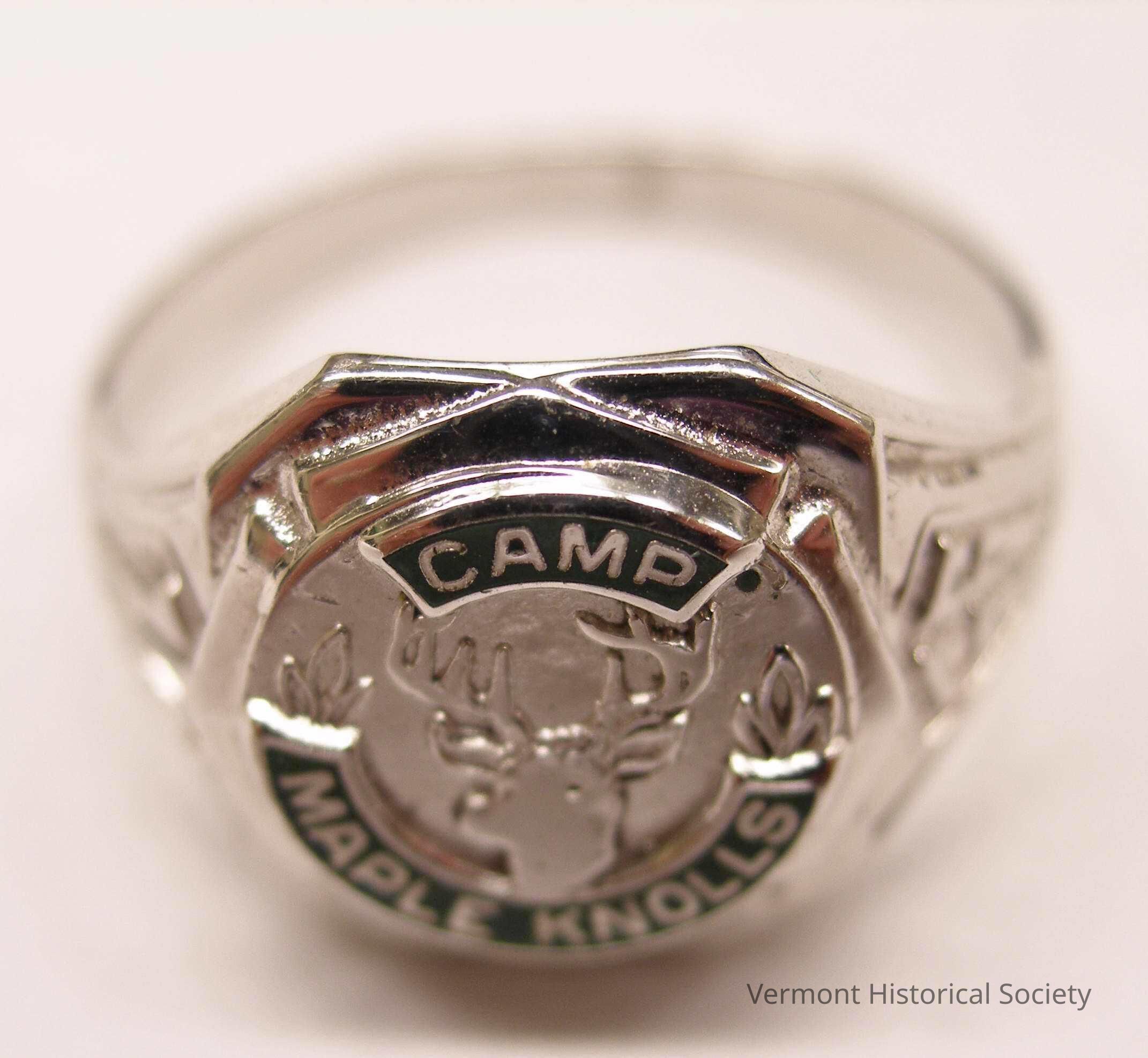 Silver ring molded at the top with a stag's head and the words, "CAMP MAPLE KNOLLS", on green enamel. The band is molded with the date 1956. The inside of the band is marked with the words, "PETERS STERLING".