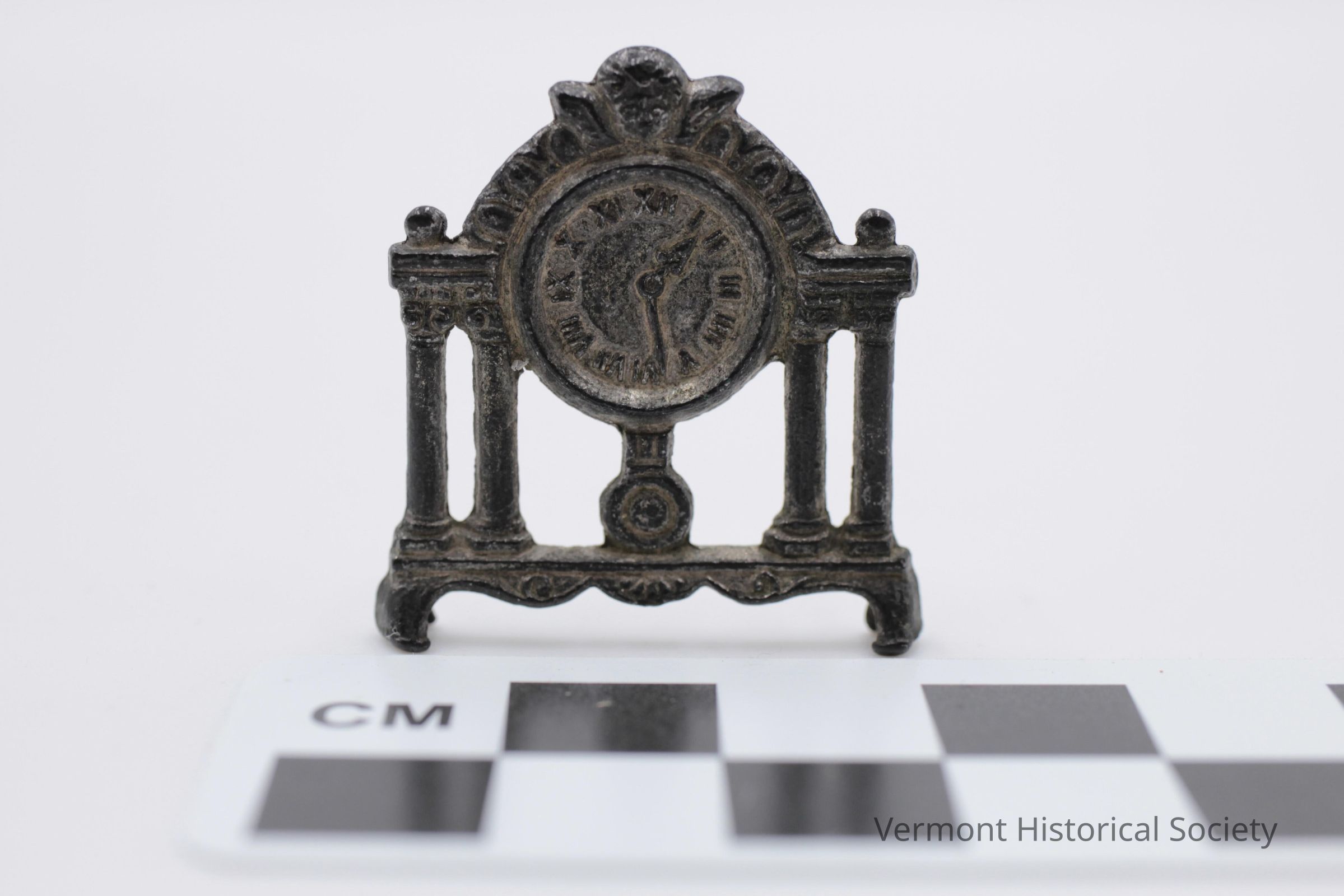 Miniature mantel clock sized for a dollhouse. The clock is molded with four columns and a face with Roman numerals.Context
