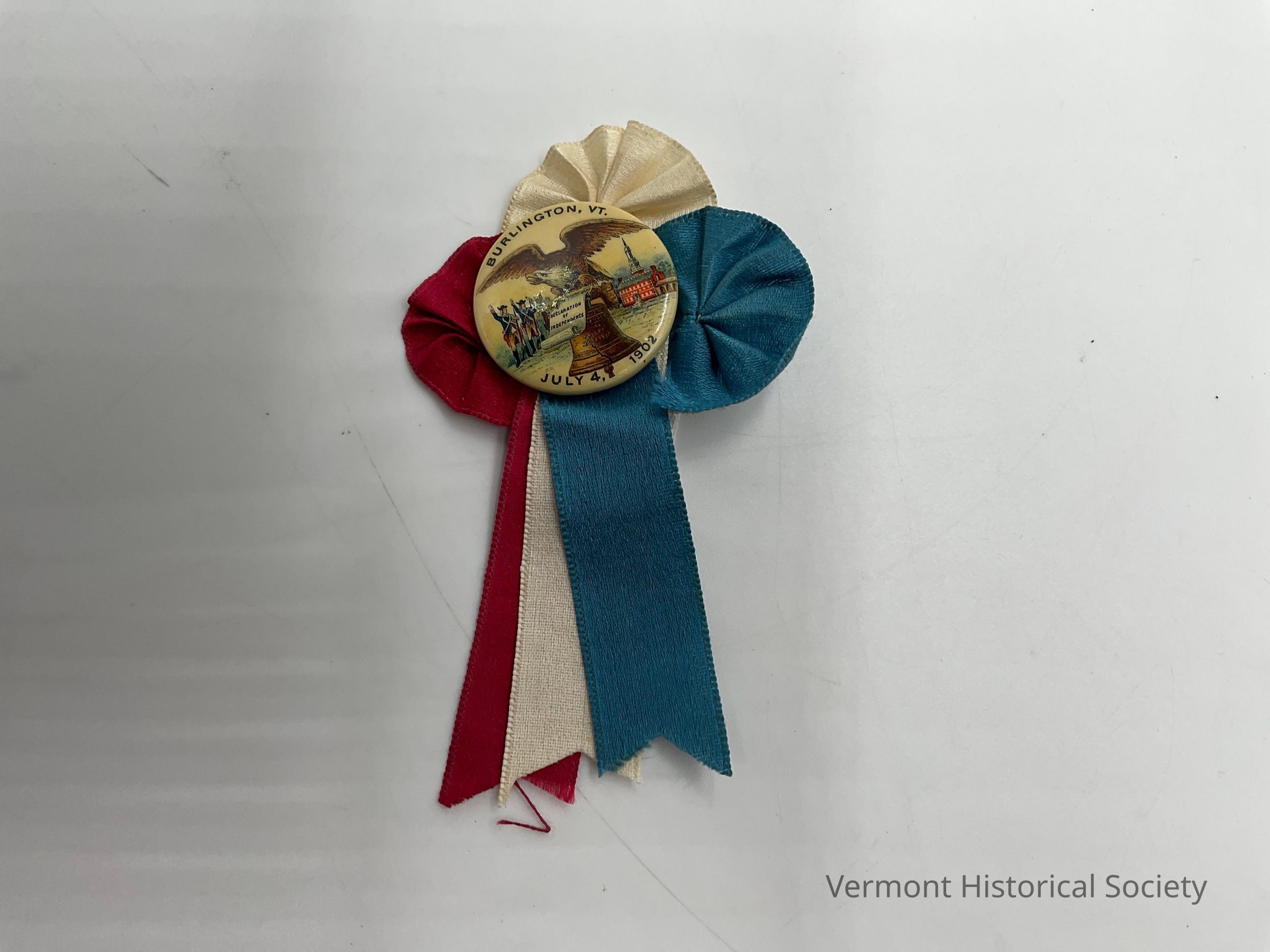 Commemorative pin with red, white and blue ribbons all round it. The pin has the image of an eagle and the liberty bell and Revolutionary War soldiers and a red-brick building. At the top are the words, "Burlington, Vt." and at the bottom, " July 4, 1902.Context