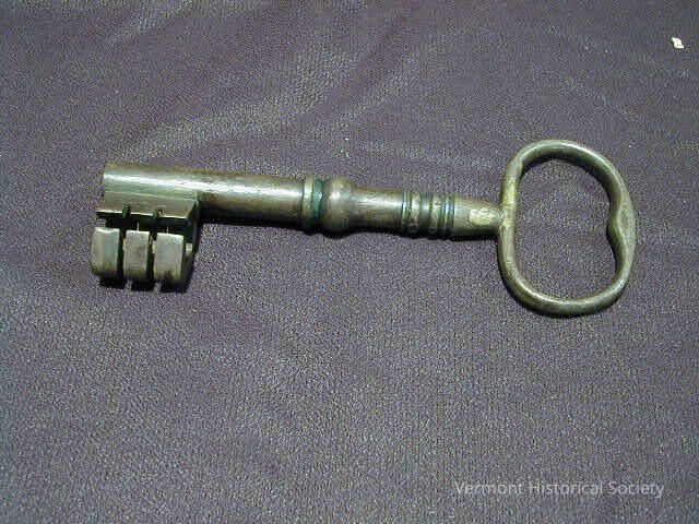 This key opened the second Vermont State House, which burned down in 1857. After the fire, the doors were taken to Middlesex and used on a church there, which also burned down.