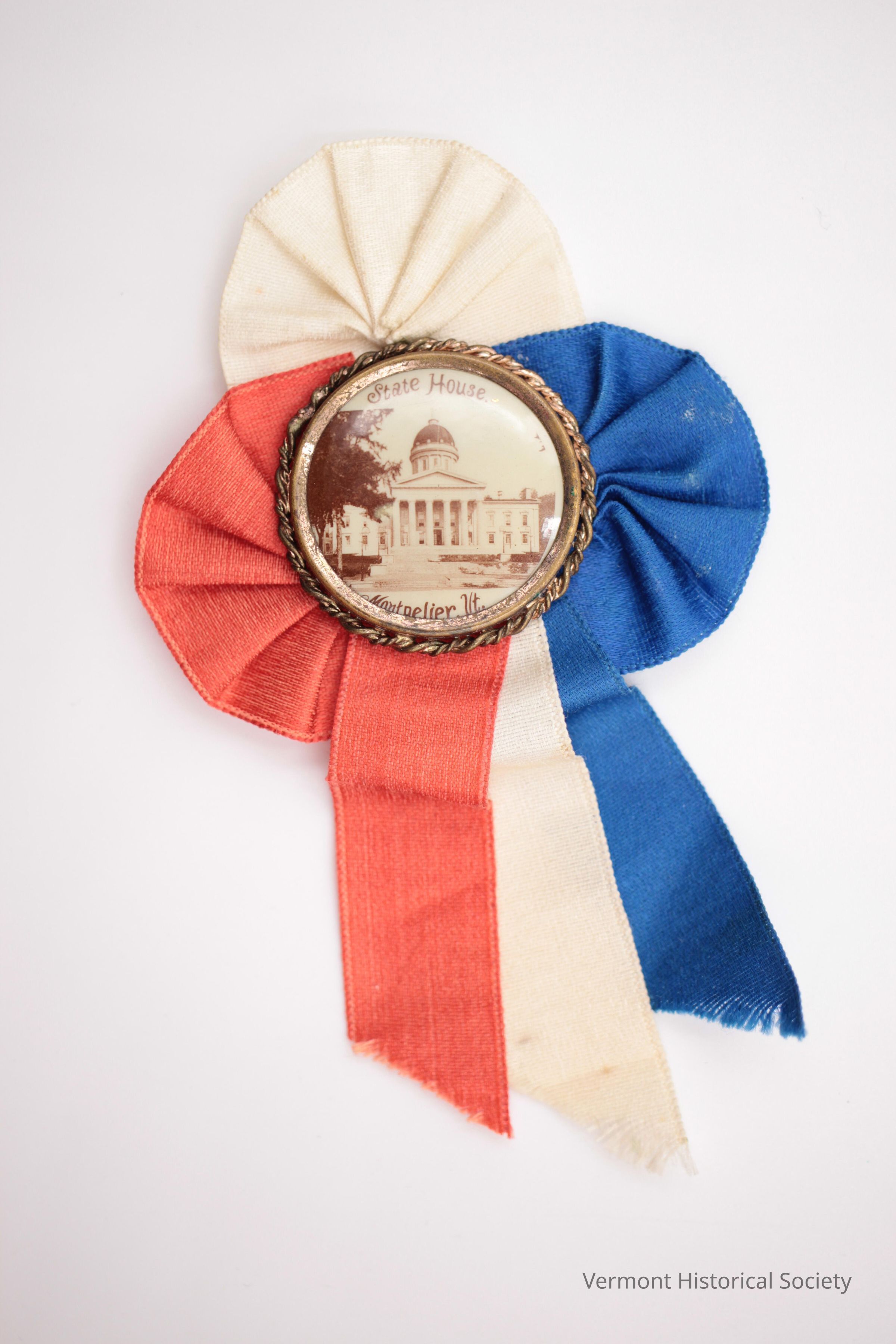 Commemorative ribbon pin consisting of three ribbons and button. The satin-woven ribbons are red, white, and blue. There are formed into three rosettes or cockades, and three tails hang below. At the center of the three rosettes is a round ceramic button printed with an image of the Vermont State House and surrounded in gold tinsel trim.Context