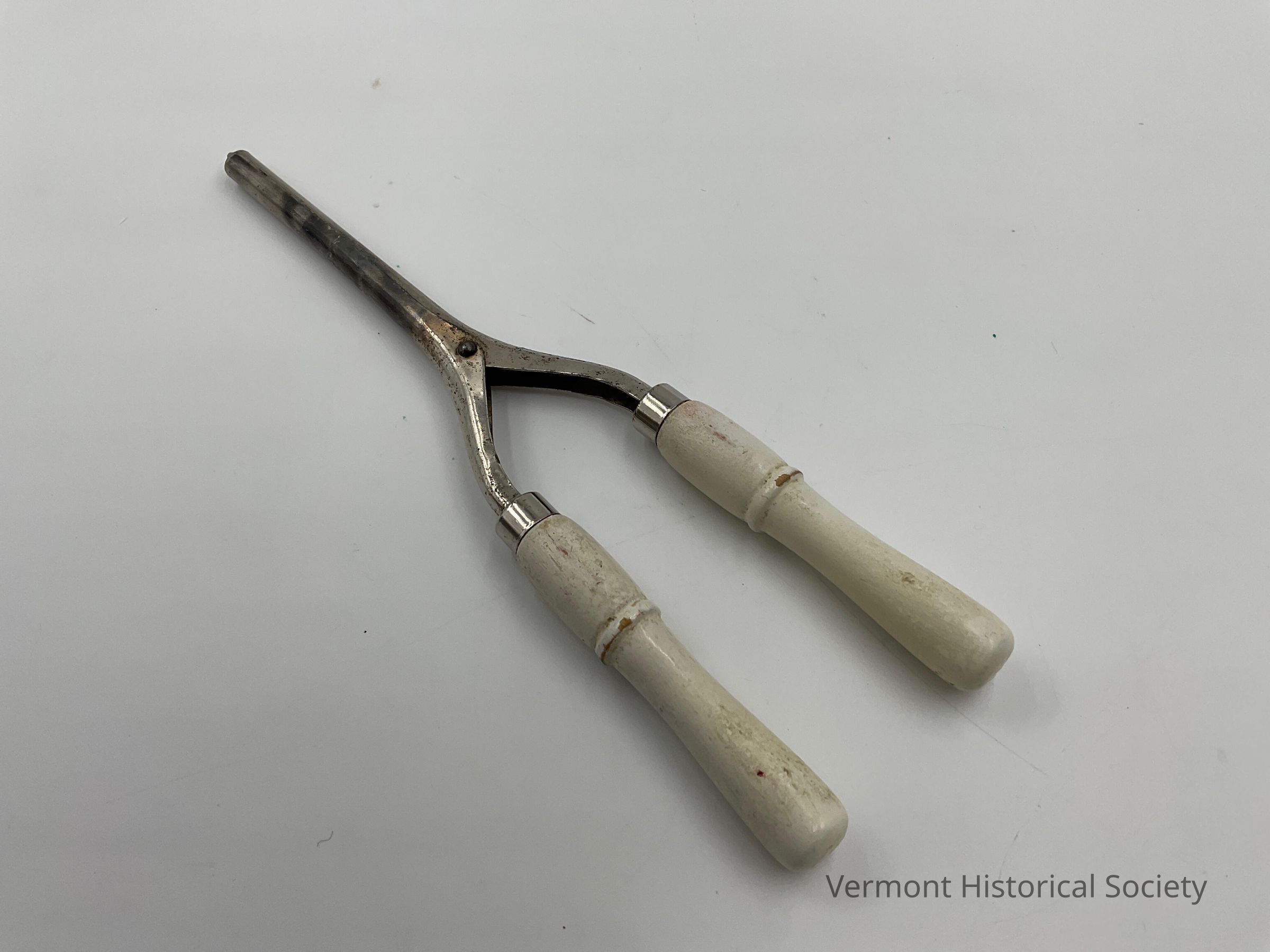 Hair curling iron consisting of metal prongs attached with a pin hinge at the center and with white-painted turned wooden handles on one end. The other end is shaped with 1 fully round prong, and 1 half-circle prong that fits closely around the other.