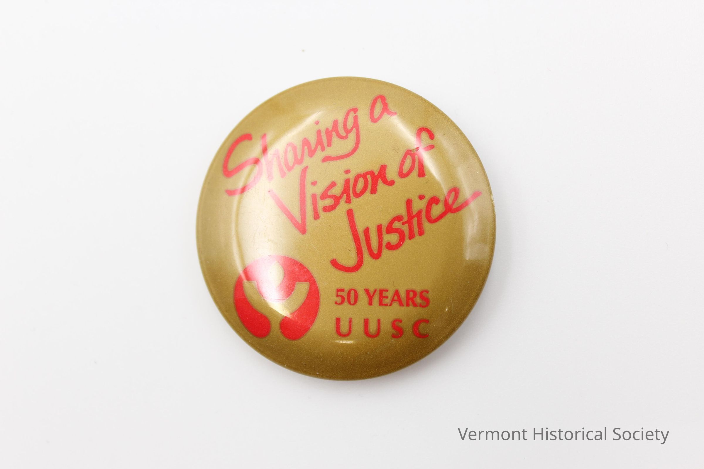 Round metal pin with gold-colored background and the inscription "Sharing a/Vison of/Justice/50 YEARS/UUSC" and an old version of the UUSC logo in red.