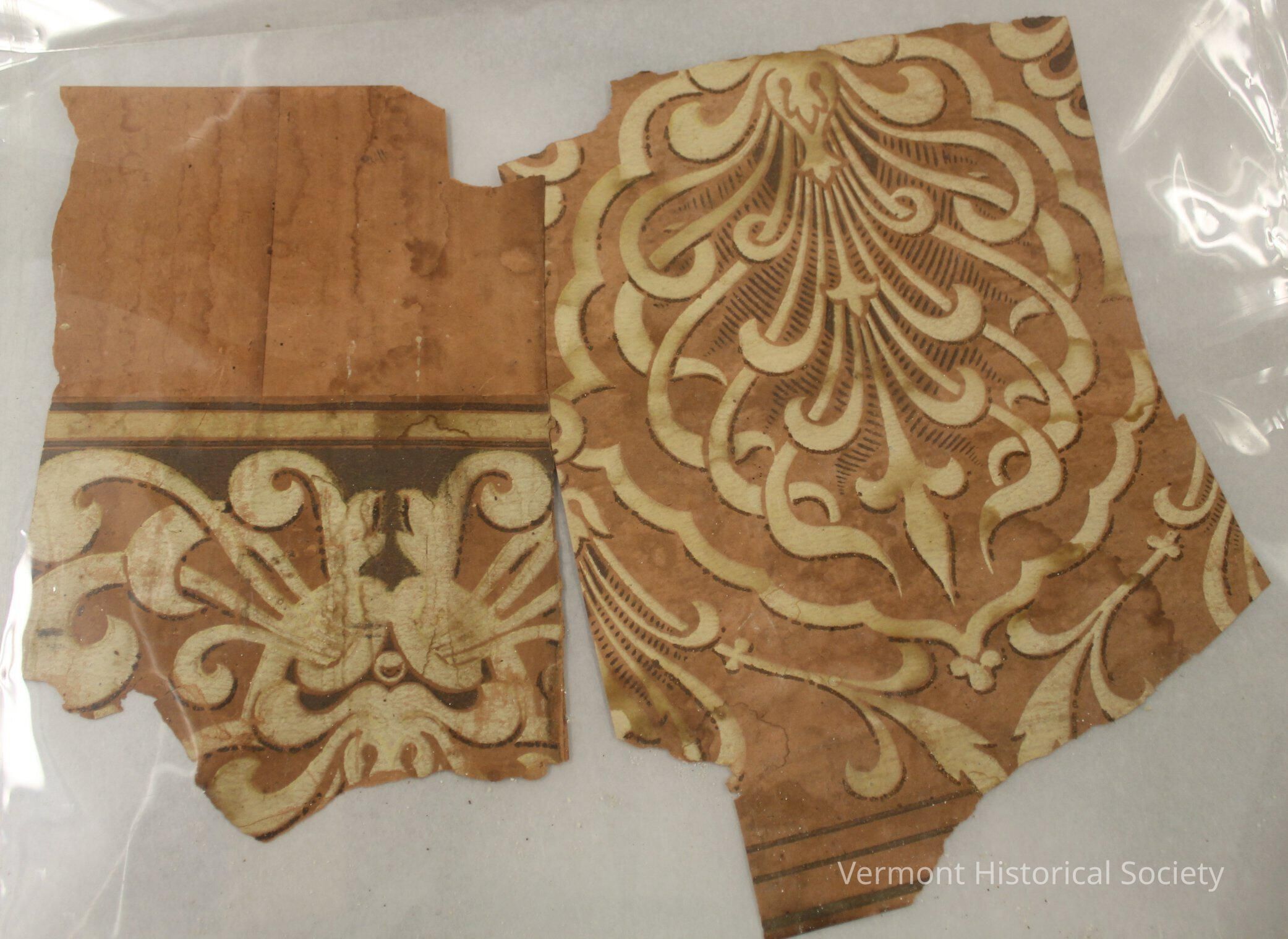 2 fragments from the same wallpaper. They are printed with portions of a large, arabesque design of cream over pink. The ground color is mixed with ground copper, giving it a glittery appearance.